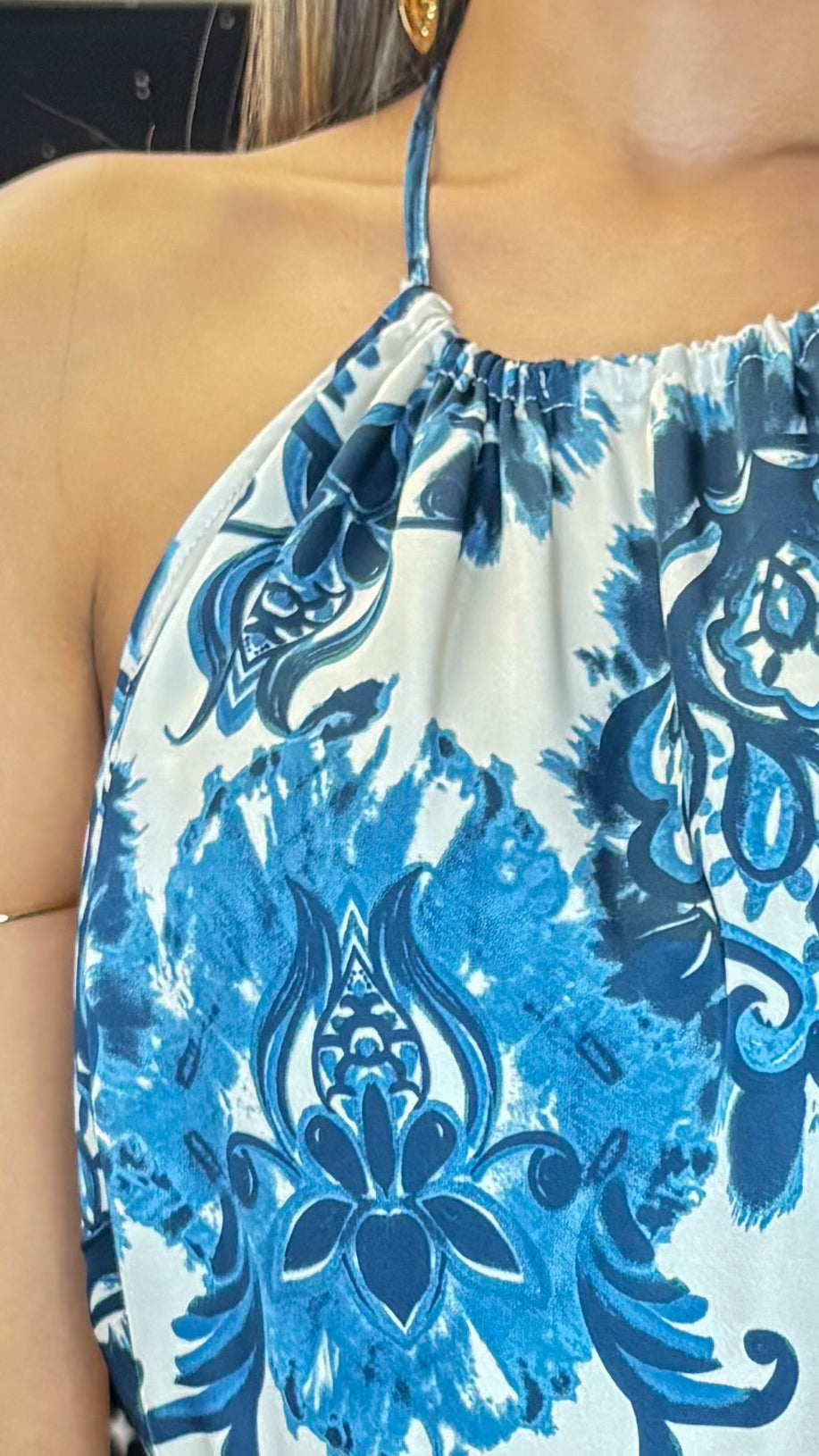 Description》 Halter jumpsuit, features zipper at back, and adjustable straps for better fit. |