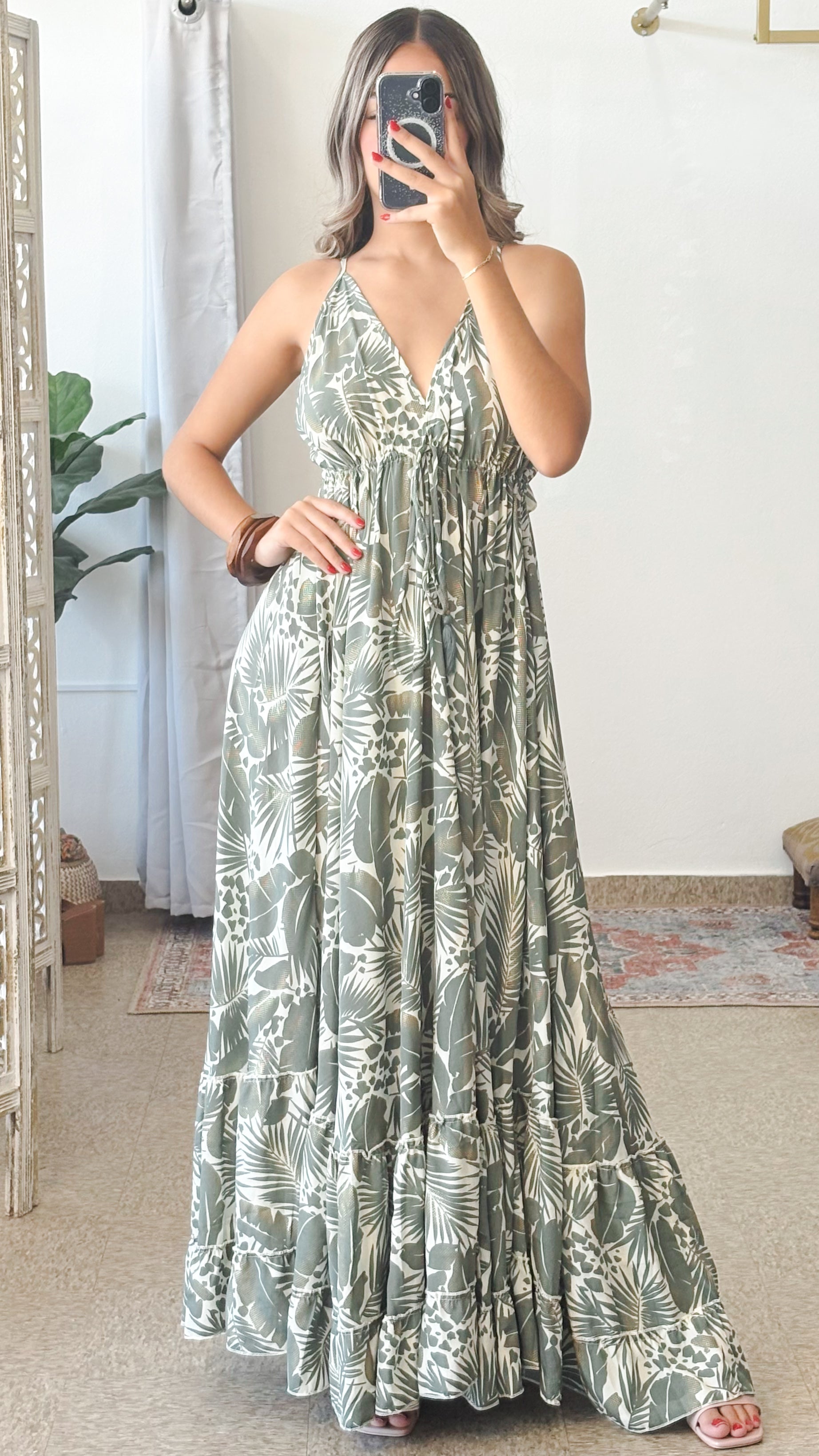 Lightweight soft fabric. A relaxed, bohemian bold print design gives a cool vibe, and sweeps from the halter neckline, into a sleeveless bodice with a V-neckline, adjustable straps, and a gorgeous ruffle at back. Features adjustable self-tie waistline for better fit.