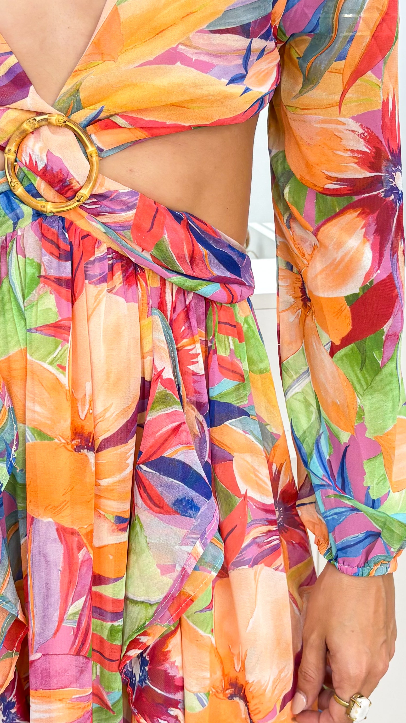 Description》 Turn every step into a celebration of color and movement with this stunning floral maxi dress. Featuring a deep V neckline, front ring detail, flirty cutouts, and soft ruffle accents, it’s the perfect blend of bold and romantic. The open back with tie closure adds an extra touch of charm, making it ideal for tropical getaways, beach weddings, or garden parties in full bloom. It's a very special piece completely handmade with lots of love ♡ Because of this, the position of the fabric pattern may be different from that shown in the product image. Consider this as an original feature of the garment, rather than a defect. |