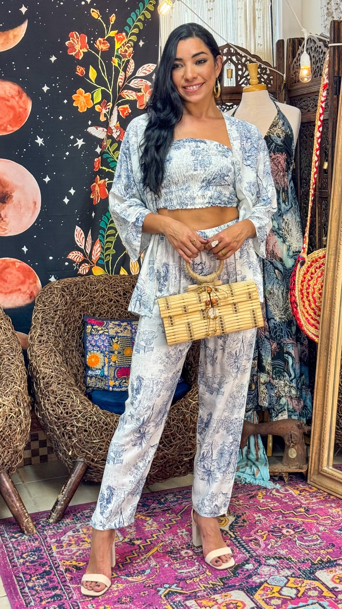 This lightweight two-piece set includes a smocked strapless top and matching flowy pants, offering a relaxed yet flattering fit. The soft, breathable fabric and elegant print make it perfect for casual days or elevated boho looks. Please note: This set includes only the top and pants. Kimono sold separately. It's a very special piece completely handmade with lots of love ♡ Because of this, the position of the fabric pattern may be different from that shown in the product image. Consider this as an original feature of the garment, rather than a defect. These pants are one size fits most, meaning they run from Small to Large, but are slightly smaller than our regular One size Aire Gypsy style. They run smaller than our Tamaya and Tali pants. About the fit》this garment fits from size 2 to 8