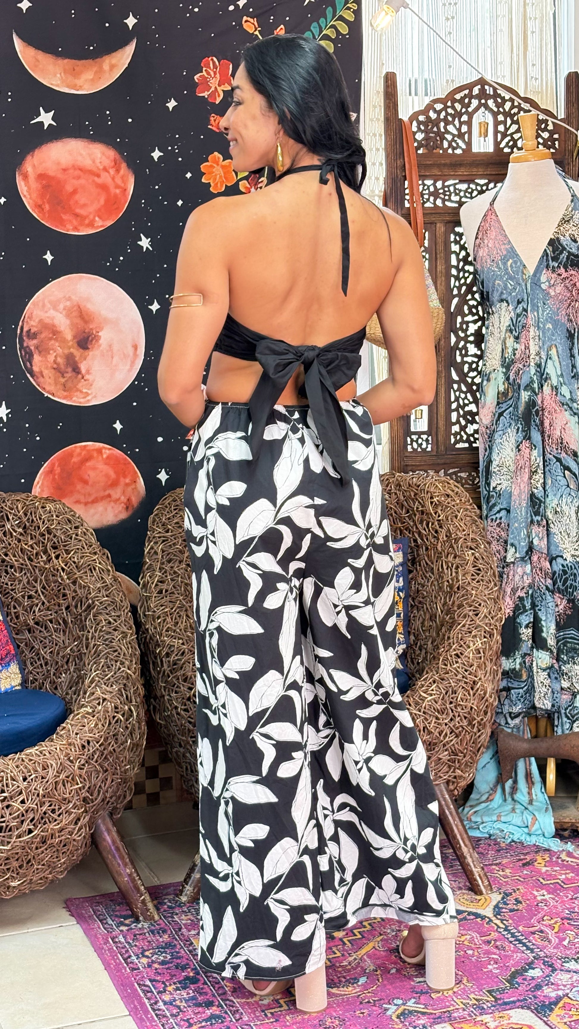 Description》 Halter jumpsuit, features adjustable strap at back, for better fit. |