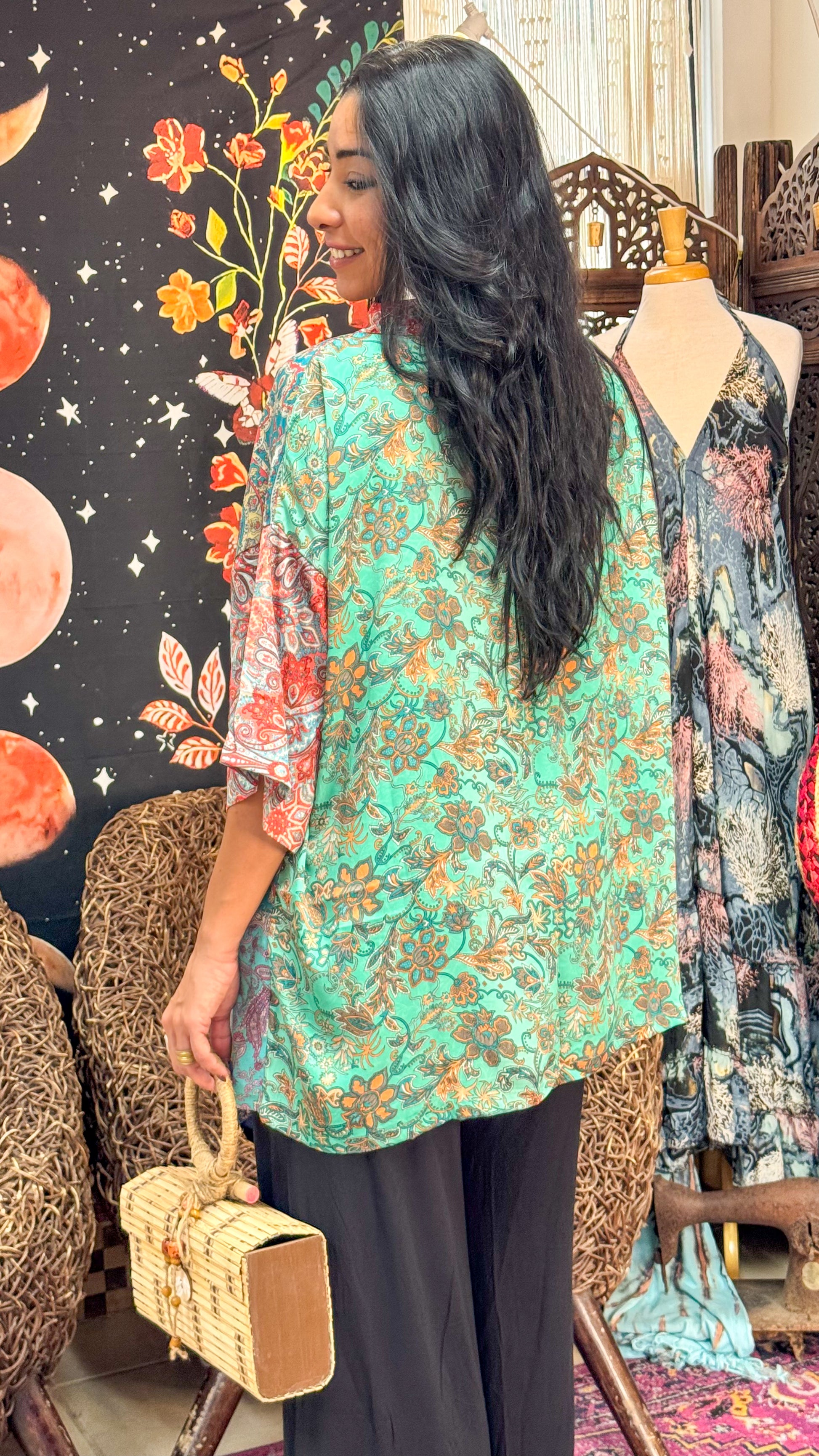 This lightweight kimono adds a vibrant boho touch to any outfit. Designed in a soft, flowy fabric, it features a beautiful floral and vine pattern in shades of lavender, red, green, and purple. The relaxed silhouette includes wide sleeves, adjustable side ties, and a draped open front for effortless movement and comfort. Perfect to layer over crop tops, dresses, or swimsuits — this piece transitions easily from casual days to resort evenings. About the fit》