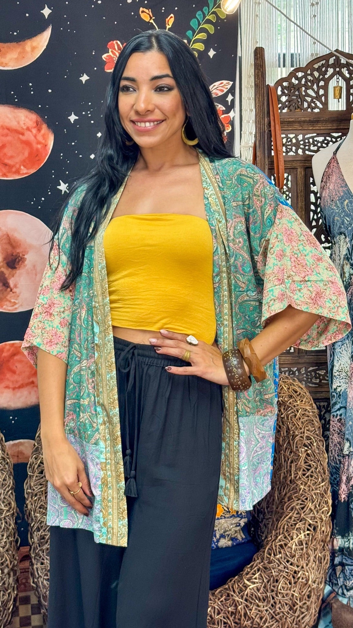 This lightweight kimono adds a vibrant boho touch to any outfit. Designed in a soft, flowy fabric, it features a beautiful floral and vine pattern in shades of lavender, red, green, and purple. The relaxed silhouette includes wide sleeves, adjustable side ties, and a draped open front for effortless movement and comfort. Perfect to layer over crop tops, dresses, or swimsuits — this piece transitions easily from casual days to resort evenings. About the fit》