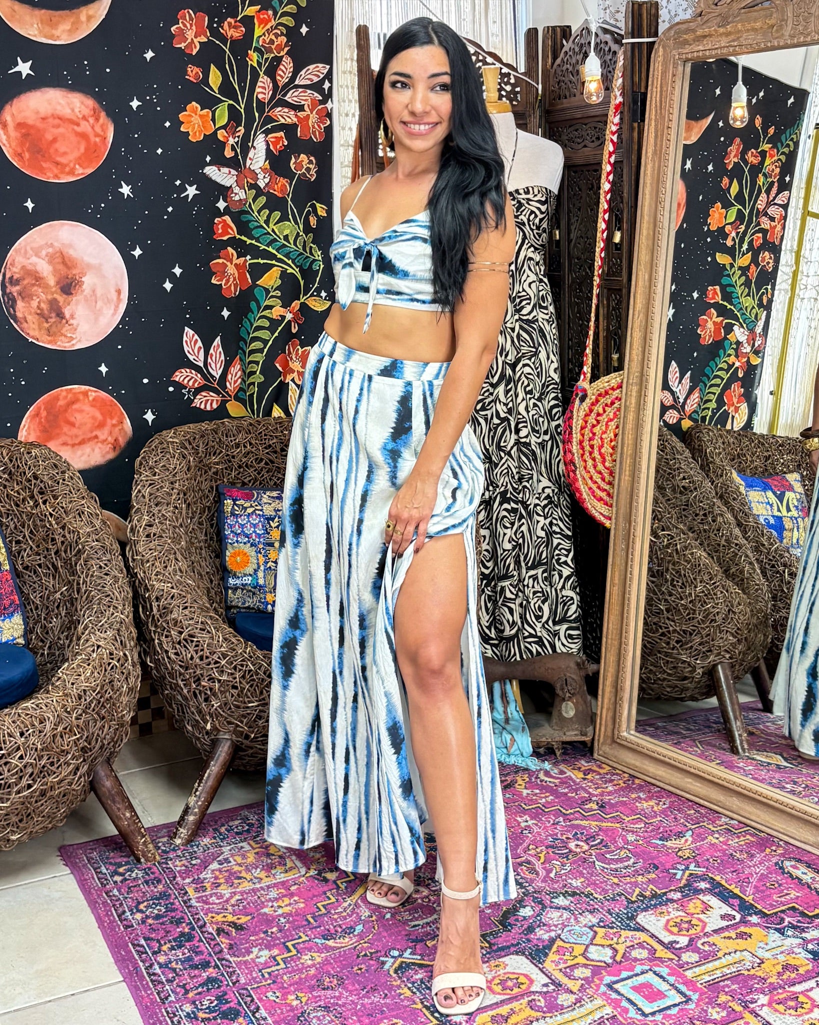 Description》 Catch the wave of effortless style in our Calliope Two-Piece Set. Featuring a soft, tie-front crop top with adjustable straps and flowy, wide-leg palazzo pants, this set is hand-dyed in a dreamy blue-and-white tie-dye pattern that channels beachside bliss and desert sunsets. Light, breathable, and full of movement, it’s your new favorite outfit for festivals, market days, or spontaneous weekend escapes. Wear it as a set for a head-turning look, or mix and match each piece with your go-to boho staples. Wherever you’re headed, this set brings that wanderlust energy with ease. Details: |