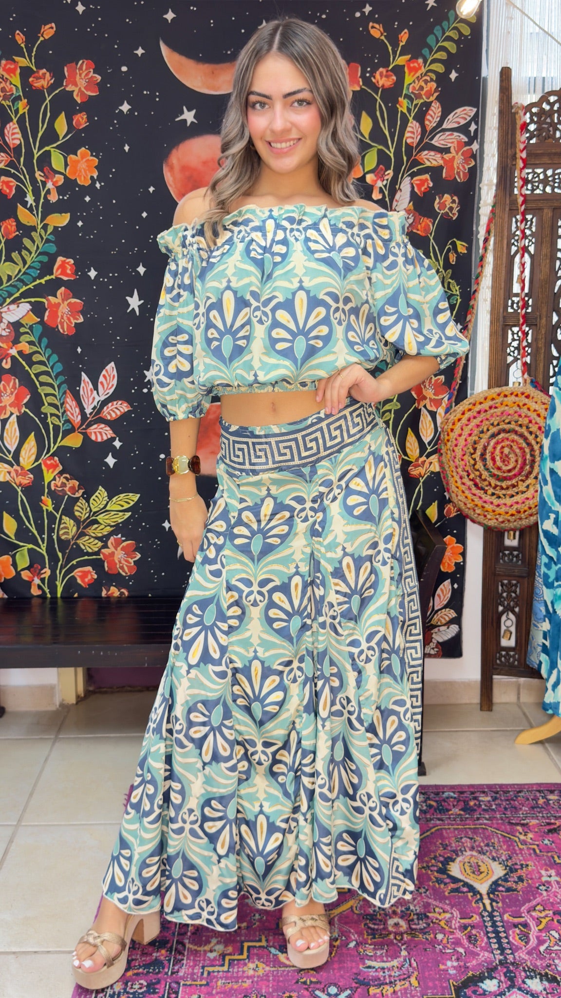 The skirt is a maxi-length piece with a relaxed, tiered silhouette that drapes beautifully. It showcases an intricate, nature-inspired print with artistic motifs, creating a visually captivating pattern. The elastic waistband with an adjustable drawstring ensures comfort and versatility, making it an effortlessly stylish and breezy wardrobe staple.