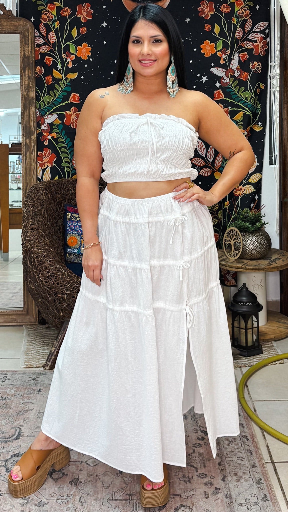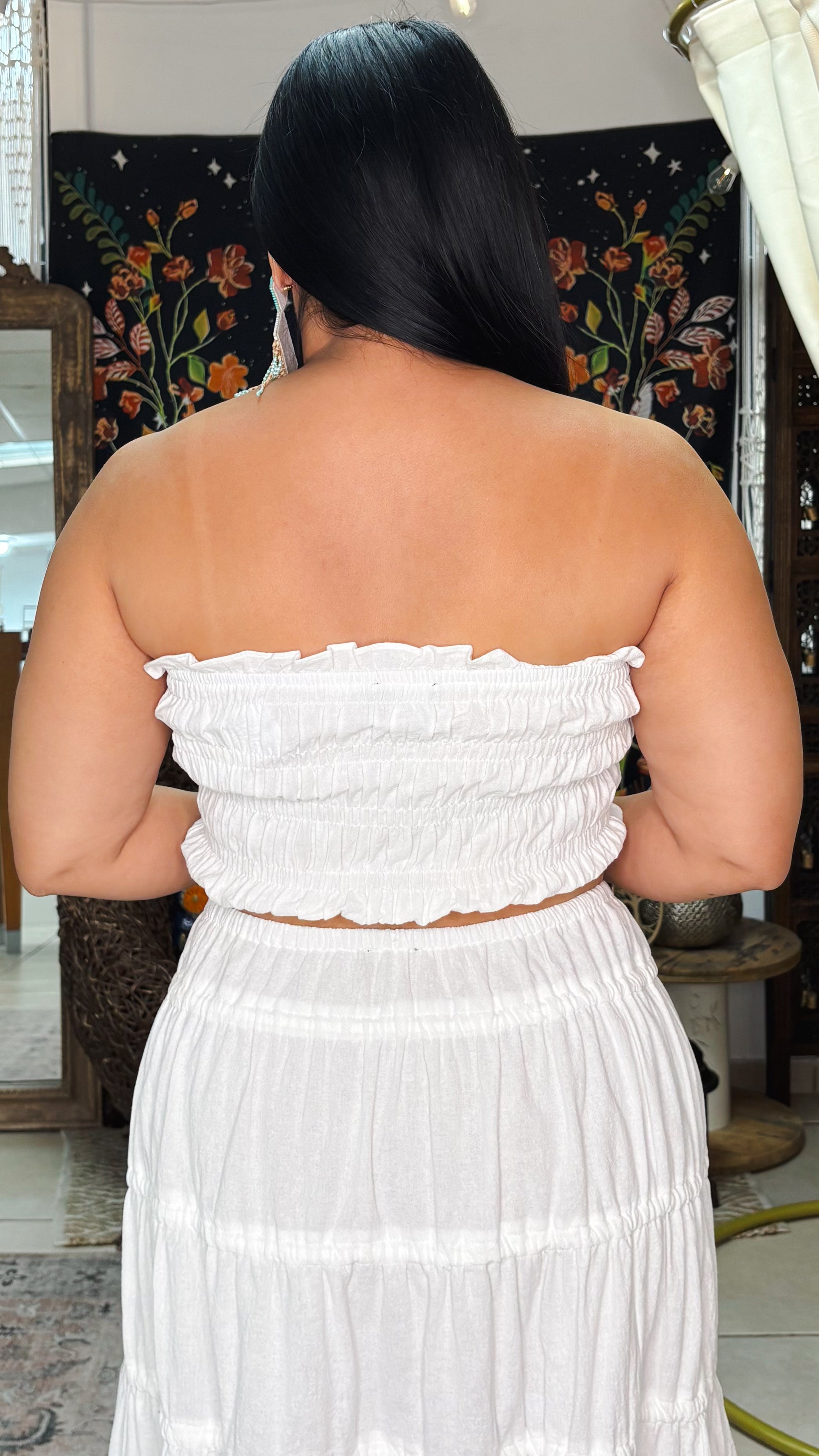 Description》 Cyrus Set Two-Piece Set – White Meet your new summer obsession: Cyrus Piece Set. This effortlessly elegant combo includes a smocked bandeau crop top with delicate ruffle trim and a breezy tiered maxi skirt that floats with every step. In crisp, clean white, it’s the ultimate expression of beachy, barefoot freedom — perfect for sun-drenched getaways, coastal strolls, or dancing under the stars. Wear it together for a head-to-toe goddess look, or mix and match with your favorite denim or boho tops. Light, airy, and made to move — this set is pure magic for the modern nomad. Details: |