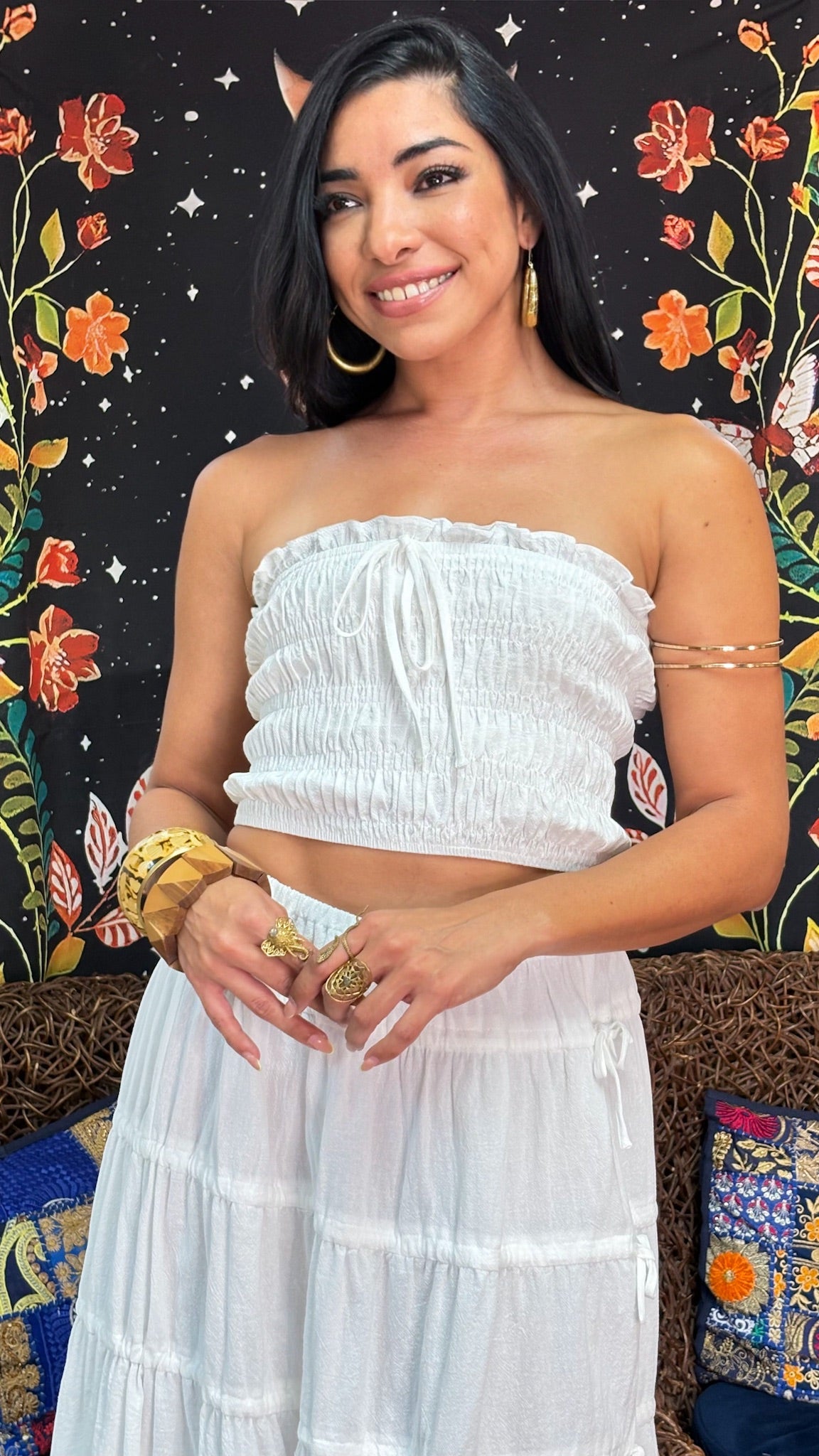 Description》 Cyrus Set Two-Piece Set – White Meet your new summer obsession: Cyrus Piece Set. This effortlessly elegant combo includes a smocked bandeau crop top with delicate ruffle trim and a breezy tiered maxi skirt that floats with every step. In crisp, clean white, it’s the ultimate expression of beachy, barefoot freedom — perfect for sun-drenched getaways, coastal strolls, or dancing under the stars. Wear it together for a head-to-toe goddess look, or mix and match with your favorite denim or boho tops. Light, airy, and made to move — this set is pure magic for the modern nomad. Details: |