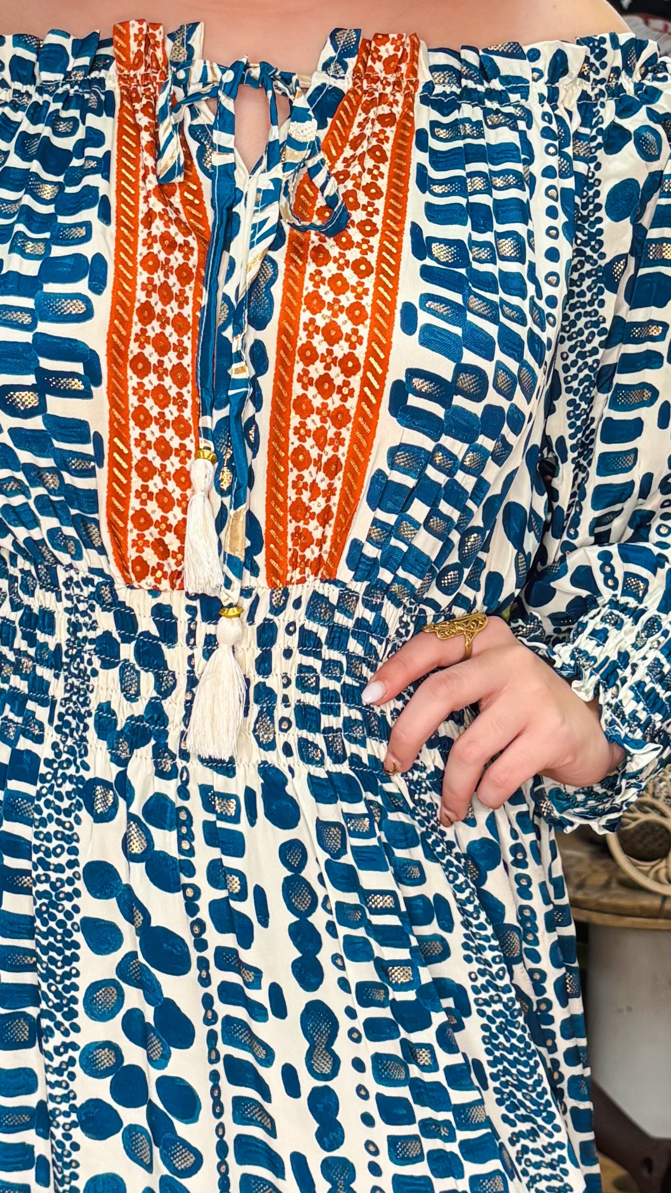 Description》 This dress is a long, flowing maxi with an off-the-shoulder neckline, featuring elasticated details for a comfortable fit. The fabric showcases a bold botanical-inspired print with large, elegant leaf-like motifs arranged symmetrically. The sleeves are voluminous, cinched at the wrists with elastic, creating a slight puff effect. The skirt portion has tiered layers, adding movement and a relaxed yet sophisticated silhouette. The lightweight material drapes beautifully, making it a perfect choice for an effortlessly chic look. |