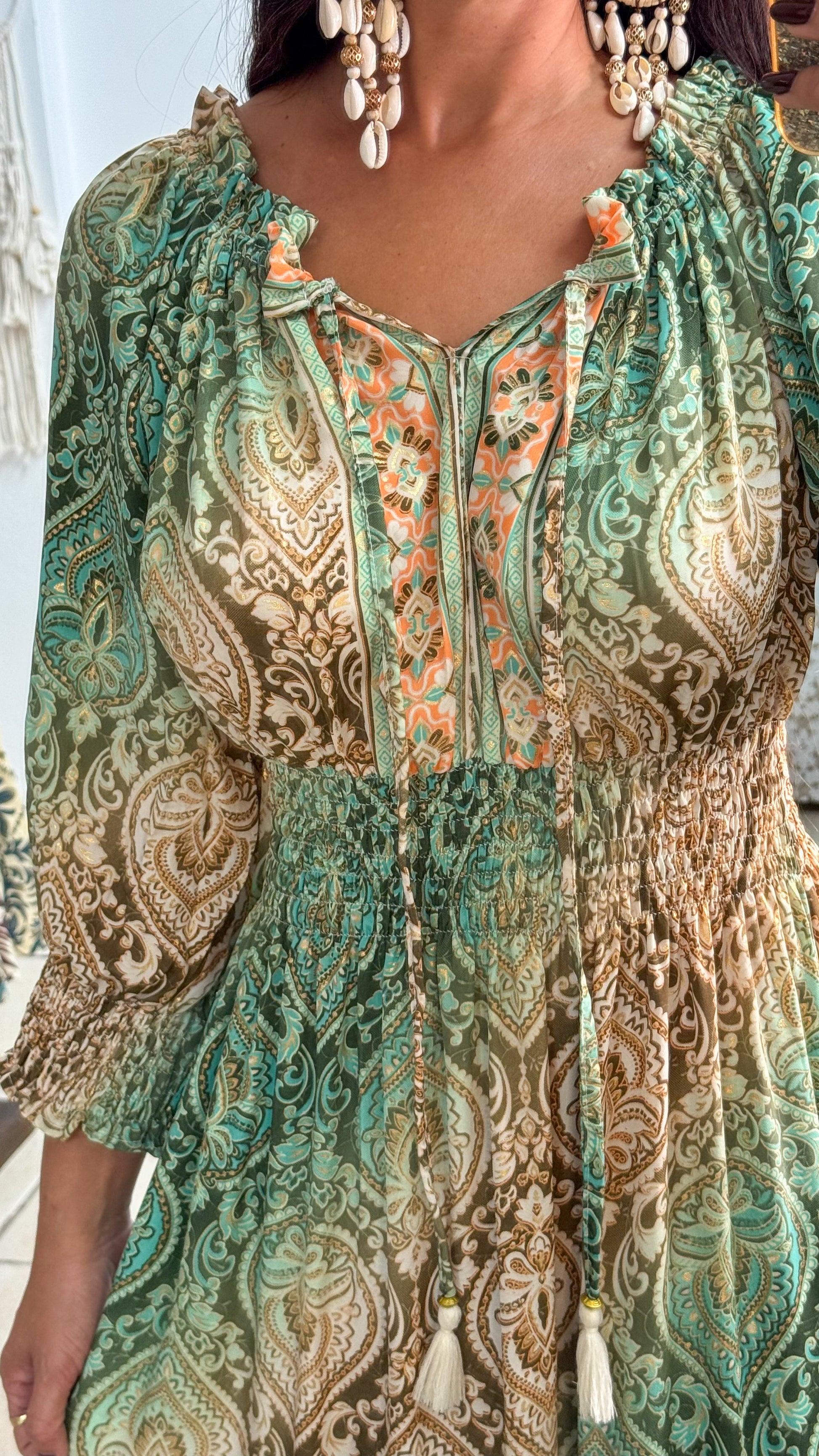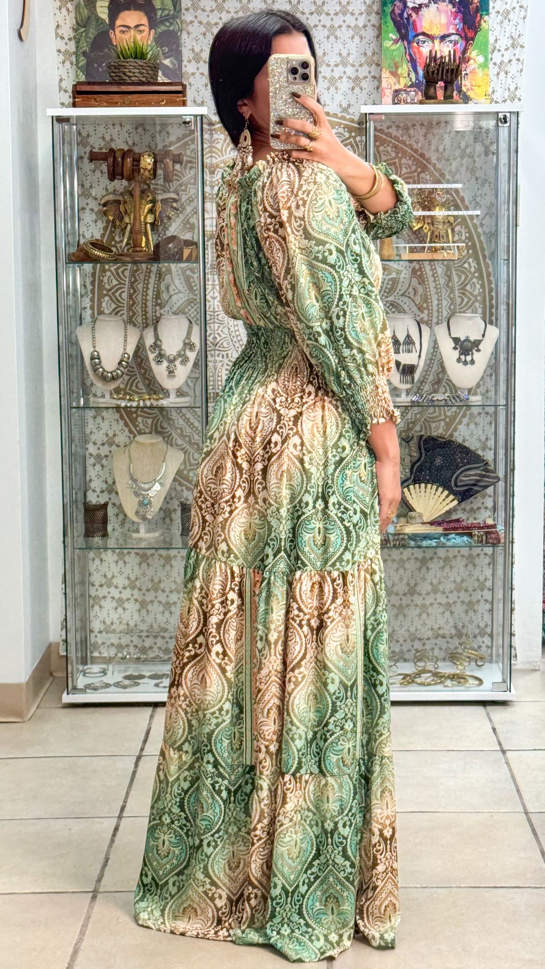 Description》 This dress is a long, flowing maxi with an off-the-shoulder neckline, featuring elasticated details for a comfortable fit. The fabric showcases a bold botanical-inspired print with large, elegant leaf-like motifs arranged symmetrically. The sleeves are voluminous, cinched at the wrists with elastic, creating a slight puff effect. The skirt portion has tiered layers, adding movement and a relaxed yet sophisticated silhouette. The lightweight material drapes beautifully, making it a perfect choice for an effortlessly chic look. |