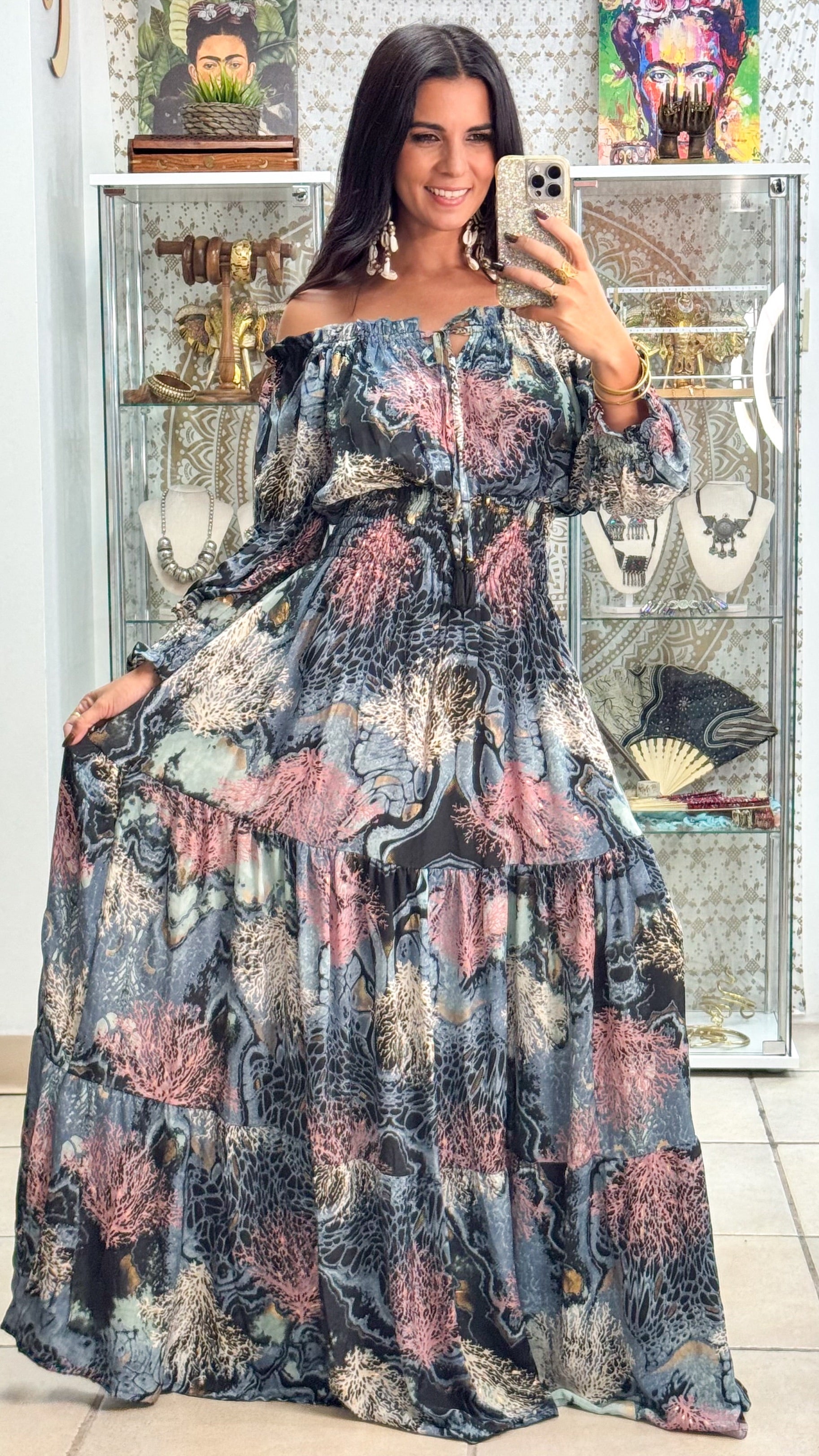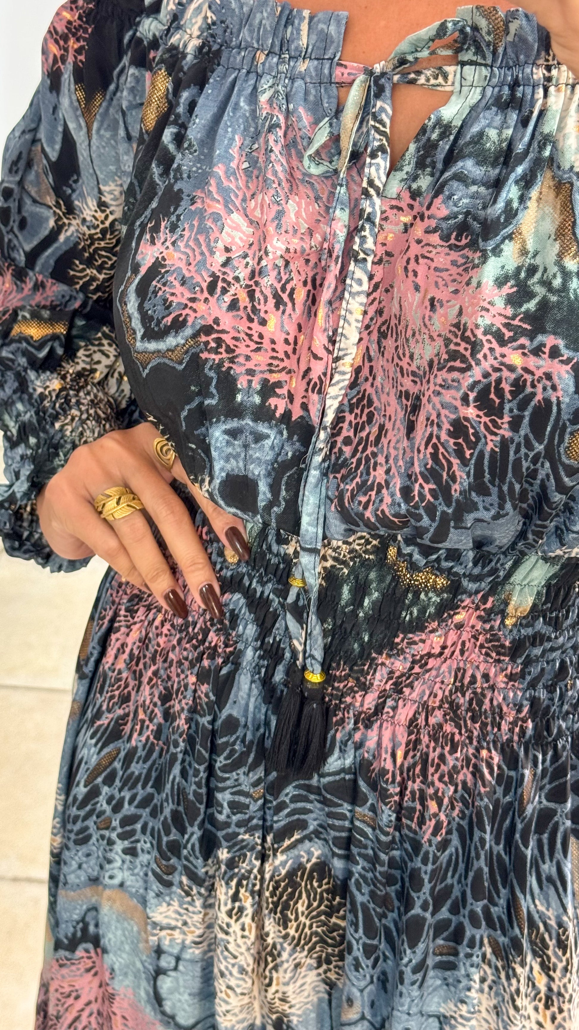 Description》 This dress is a long, flowing maxi with an off-the-shoulder neckline, featuring elasticated details for a comfortable fit. The fabric showcases a bold botanical-inspired print with large, elegant leaf-like motifs arranged symmetrically. The sleeves are voluminous, cinched at the wrists with elastic, creating a slight puff effect. The skirt portion has tiered layers, adding movement and a relaxed yet sophisticated silhouette. The lightweight material drapes beautifully, making it a perfect choice for an effortlessly chic look. |