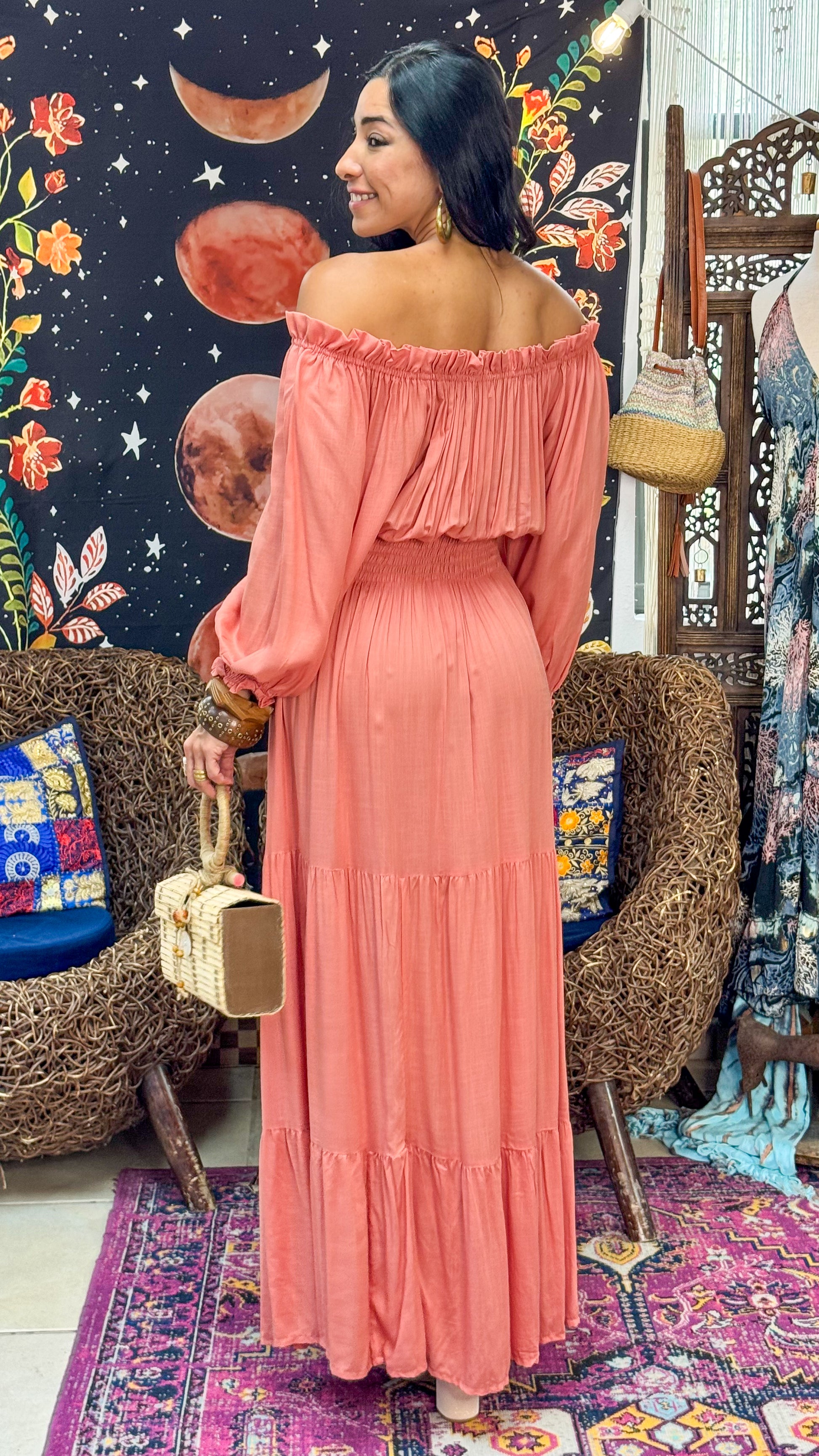 Description》 This dress is a long, flowing maxi with an off-the-shoulder neckline, featuring elasticated details for a comfortable fit. The fabric showcases a bold botanical-inspired print with large, elegant leaf-like motifs arranged symmetrically. The sleeves are voluminous, cinched at the wrists with elastic, creating a slight puff effect. The skirt portion has tiered layers, adding movement and a relaxed yet sophisticated silhouette. The lightweight material drapes beautifully, making it a perfect choice for an effortlessly chic look. |