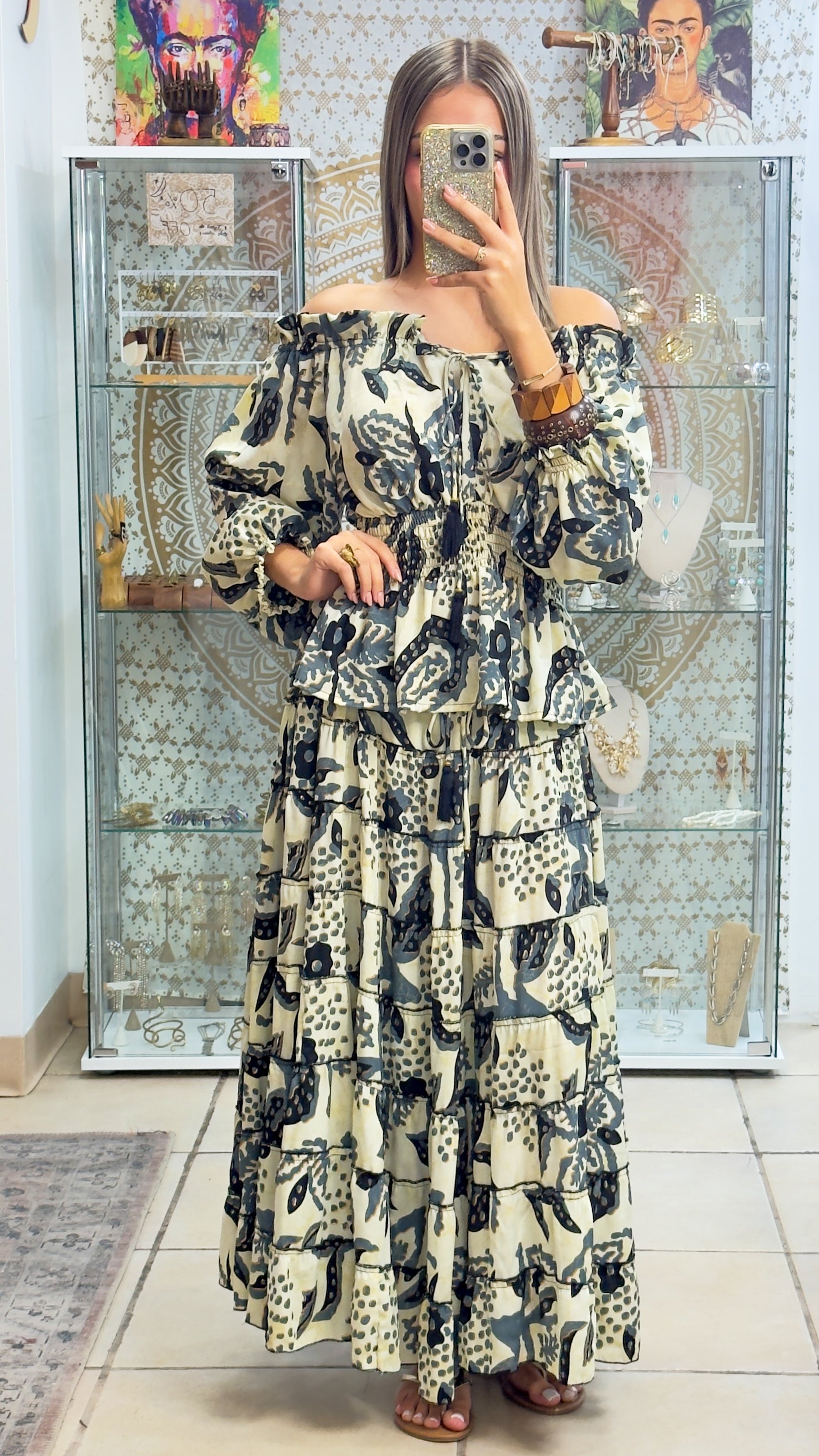 The skirt is a maxi-length piece with a relaxed, tiered silhouette that drapes beautifully. It showcases an intricate, nature-inspired print with artistic motifs, creating a visually captivating pattern. The elastic waistband with an adjustable drawstring ensures comfort and versatility, making it an effortlessly stylish and breezy wardrobe staple. |