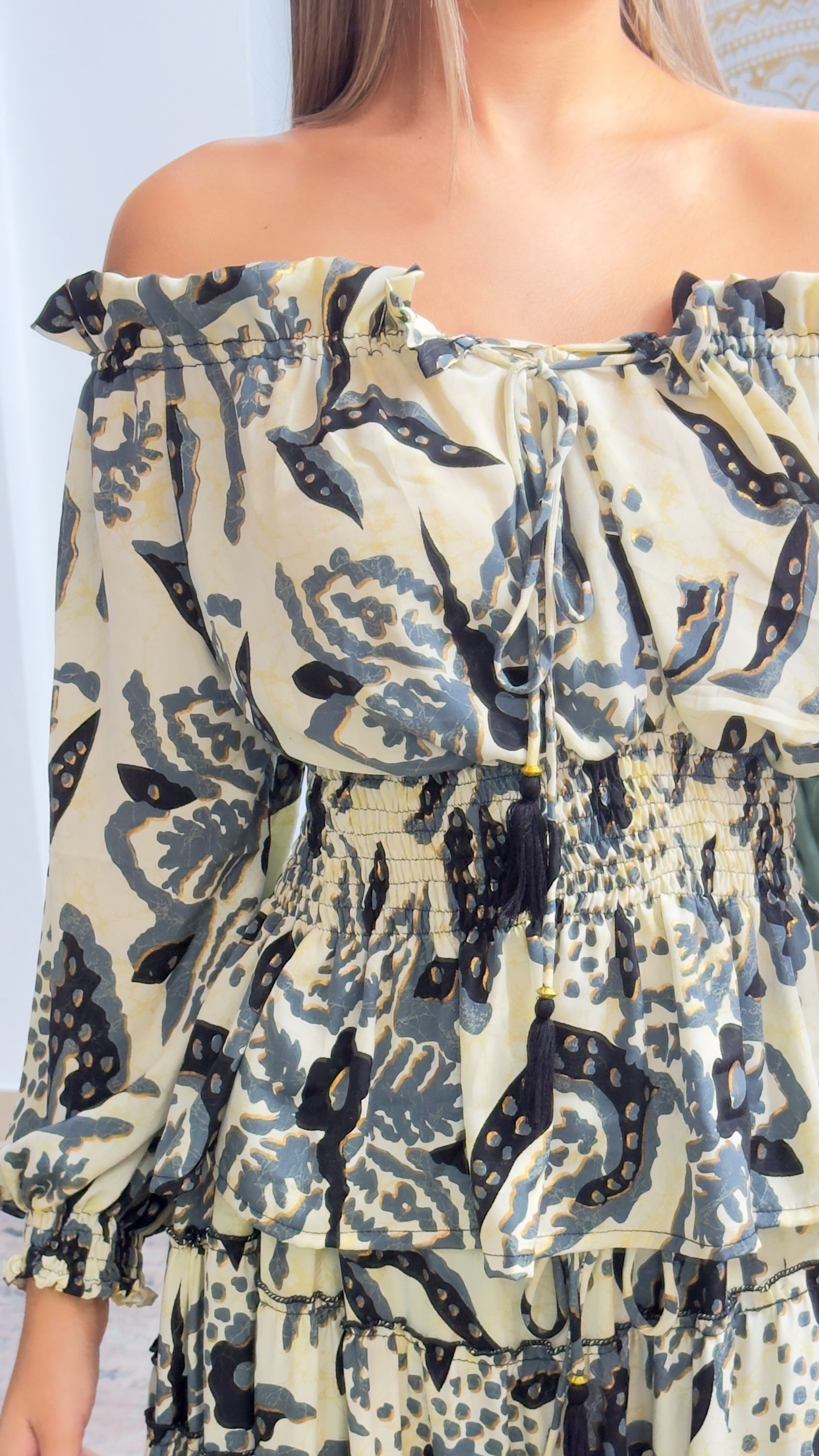 Description》 The top features an off-the-shoulder design with a ruffled neckline and a delicate tie detail at the center. It has voluminous, billowy sleeves with elasticated cuffs, adding a touch of bohemian elegance. The smocked waistline cinches in for a flattering silhouette, and the peplum-style hem enhances its flowy, feminine look.