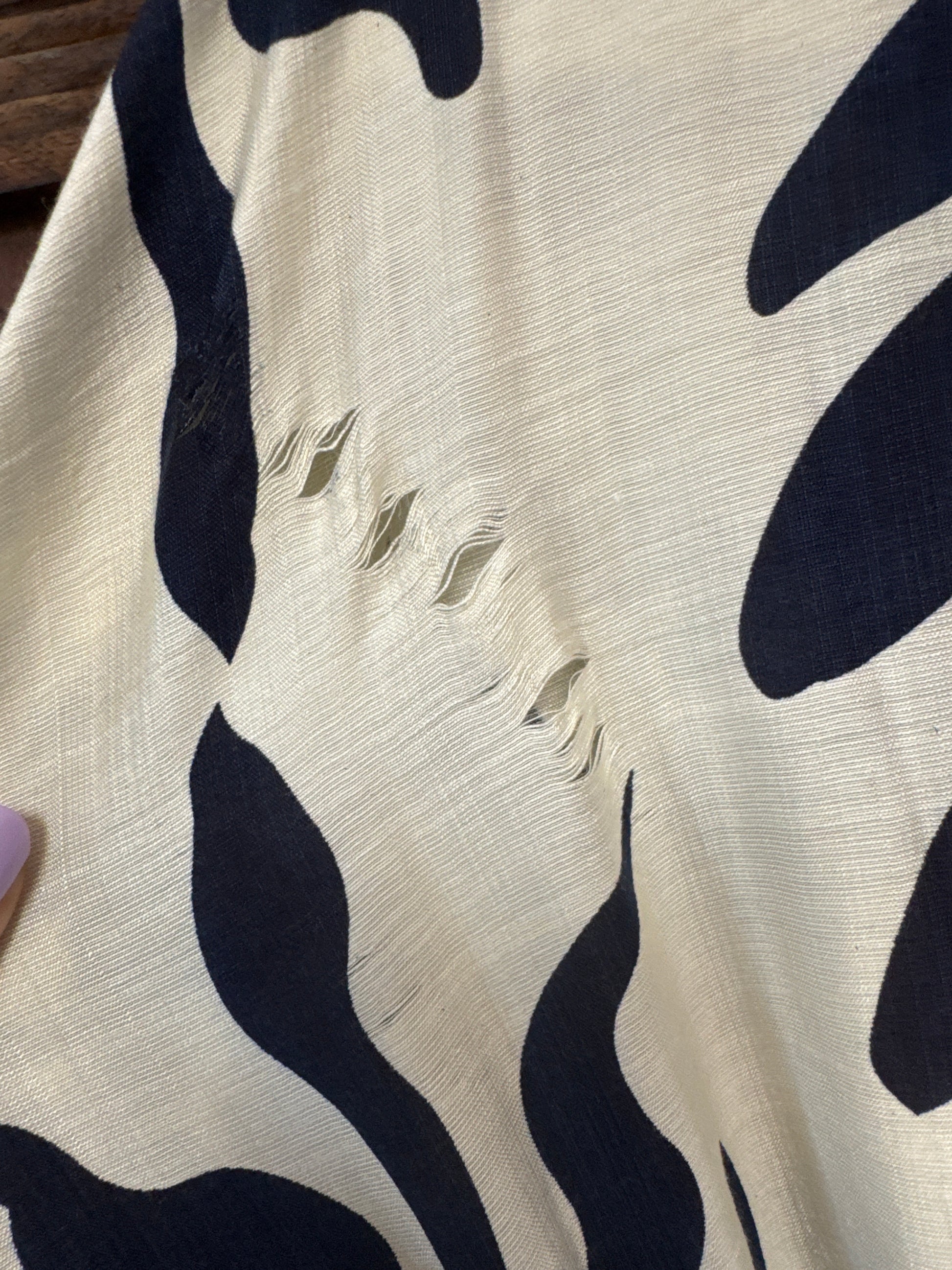 Description》 Damage: Tear in the front area A flowy maxi dress with wide sleeves, a flattering V-neckline, and a self-tie waist. Designed with a bold botanical print and a soft, crinkled texture that moves beautifully with every step. From beachside dinners to weekend festivals, this dress brings effortless elegance with a dash of bohemian fire. Just add sandals and statement earrings — and let your free spirit shine. Details: • Lightweight, silky fabric with luxurious drape • Bold paisley print in golden hues • Kimono sleeves with wide flowy cut • Adjustable tie waist for a flattering fit • Side slit for movement and flair • Made in USA