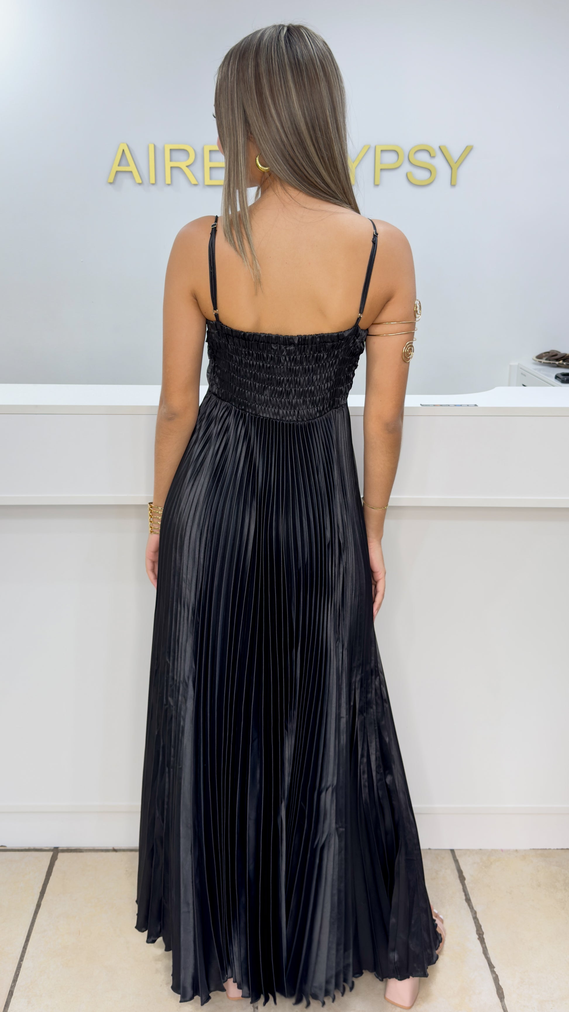 Description》 Turn heads in this stunning Emeralda maxi dress, designed with a silky pleated skirt that flows gracefully with every step. The delicate spaghetti straps and ruched bodice create a flattering fit, while the lightweight fabric adds elegance and comfort. Perfect for weddings, formal dinners, or any special occasion where you want to shine.