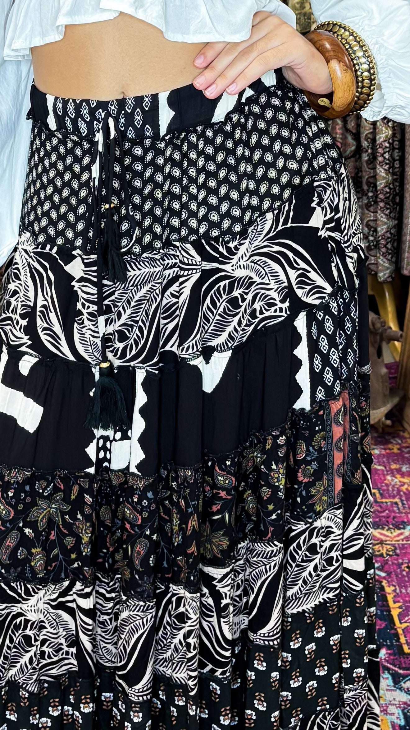 Feel the rhythm of the sun in our Hippie Maxi Skirt — a bold and breezy statement piece that moves with your free spirit. Designed with a comfy elastic waist and playful tassel ties, it’s perfect for dancing barefoot at festivals, strolling through markets, or dressing up for a sunset dinner. Made from breathable fabric and crafted for comfort and versatility, this skirt pairs beautifully with everything from graphic tees to crop tops. Just add your favorite sandals or boots and let your bohemian soul shine. Details: • Full-length tiered silhouette • Vibrant-inspired print • Elastic waistband with tassel drawstring • Lightweight and flowy for all-day wear • Made in India with love Fit: this garment fits one size, from xsmall to large. Composition: 70% Sateen 30% Polyester Lining: unlined Model Info》 Size: 2 / small Height: 5'6" Bust: 32"- 34C Waist: 24" Hips: 36" |