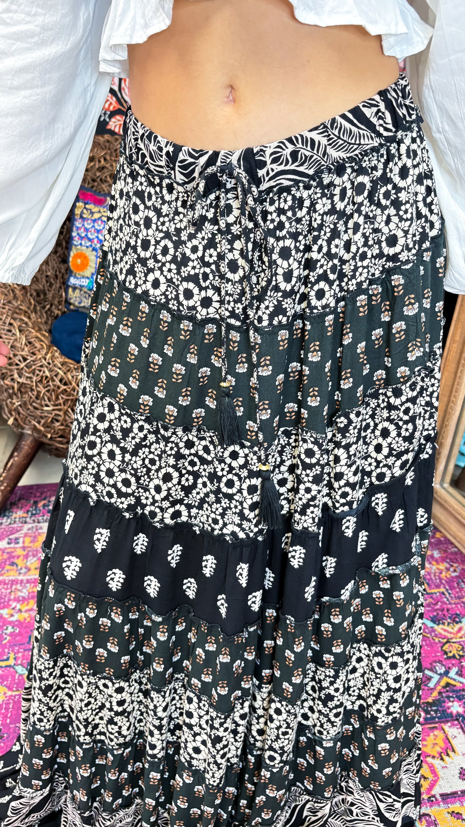 Feel the rhythm of the sun in our Hippie Maxi Skirt — a bold and breezy statement piece that moves with your free spirit. Designed with a comfy elastic waist and playful tassel ties, it’s perfect for dancing barefoot at festivals, strolling through markets, or dressing up for a sunset dinner. Made from breathable fabric and crafted for comfort and versatility, this skirt pairs beautifully with everything from graphic tees to crop tops. Just add your favorite sandals or boots and let your bohemian soul shine. Details: • Full-length tiered silhouette • Vibrant-inspired print • Elastic waistband with tassel drawstring • Lightweight and flowy for all-day wear • Made in India with love Fit: this garment fits one size, from xsmall to large. Composition: 70% Sateen 30% Polyester Lining: unlined Model Info》 Size: 2 / small Height: 5'6" Bust: 32"- 34C Waist: 24" Hips: 36" |