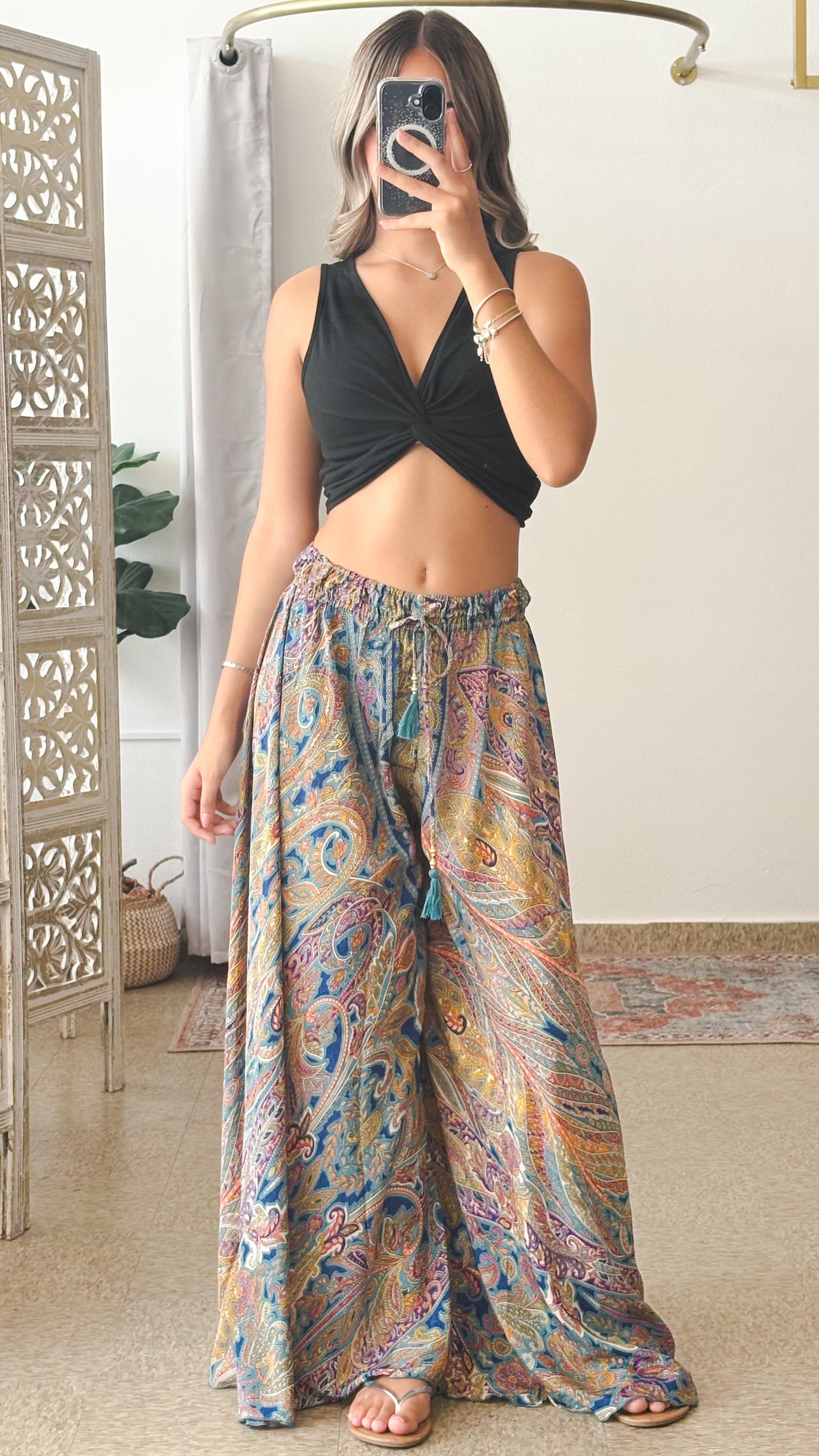 These wide-leg pants are a dreamy blend of comfort and boho charm. Featuring a flowy silhouette with a smocked waistband and adjustable tassel tie, they move effortlessly with every step. The lightweight fabric and intricate print make them perfect for beach strolls, market days, or a relaxed night out. Style them with your favorite crop top or a breezy blouse for that free-spirited vibe.