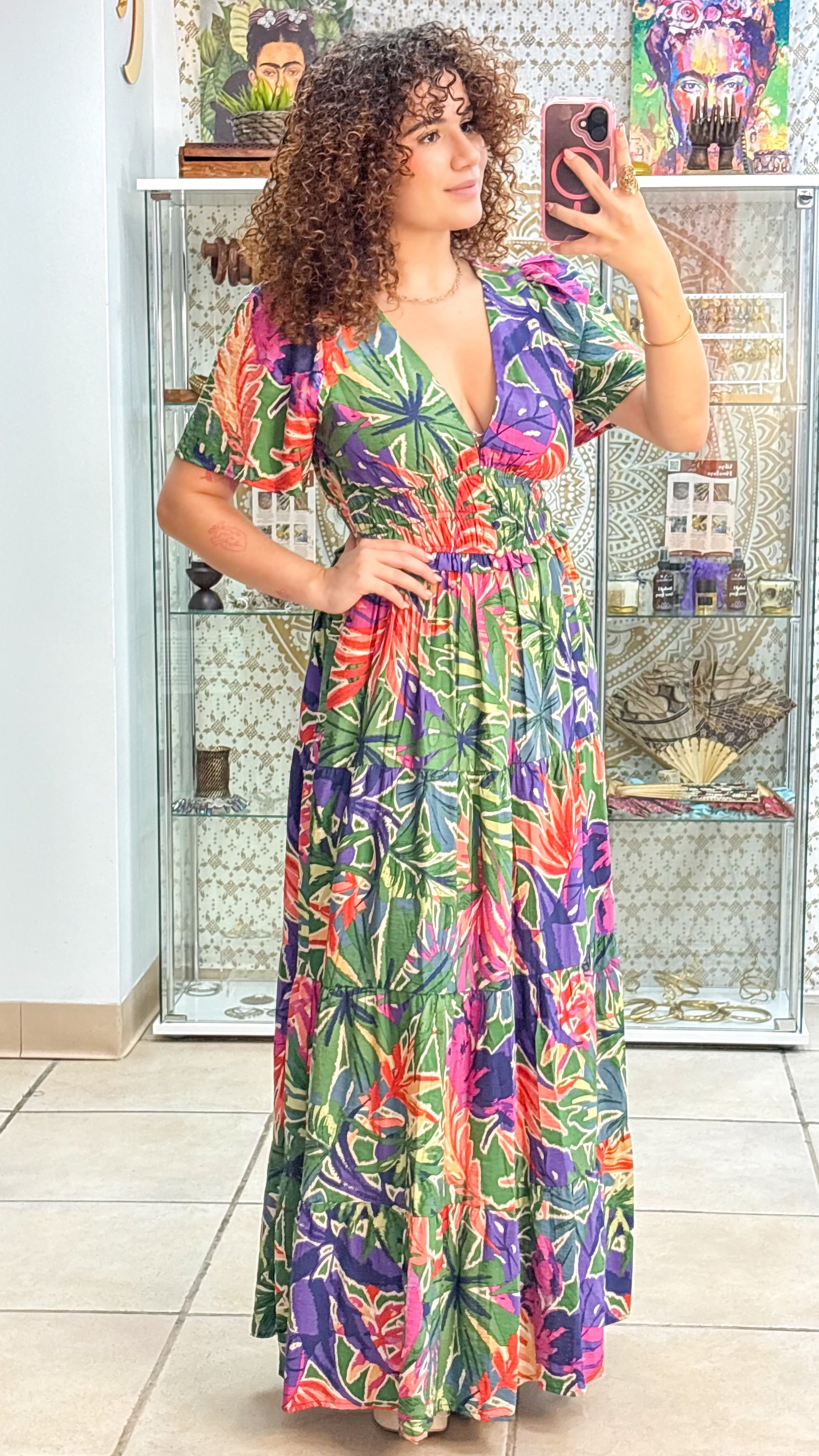 Description》 Awaken your wild spirit in the Jungle Muse Maxi, a bohemian dream inspired by tropical escapes. Featuring a deep V-neckline and softly puffed short sleeves, this flowy silhouette flatters effortlessly. The bold botanical print—layered in lush greens, coral, violet, and fuchsia—brings the vibrant energy of the jungle to life. A cinched waist with an adjustable tie defines the shape, while side pockets add that laid-back, practical charm. Perfect for sun-drenched days, beach getaways, or golden hour strolls in woven platforms. From beachside dinners to weekend festivals, this dress brings effortless elegance with a dash of bohemian fire. Just add sandals and statement earrings — and let your free spirit shine. Details: • Lightweight, silky fabric with luxurious drape • Bold paisley print in golden hues • Kimono sleeves with wide flowy cut • Adjustable tie waist for a flattering fit • Side slit for movement and flair • Made in USA