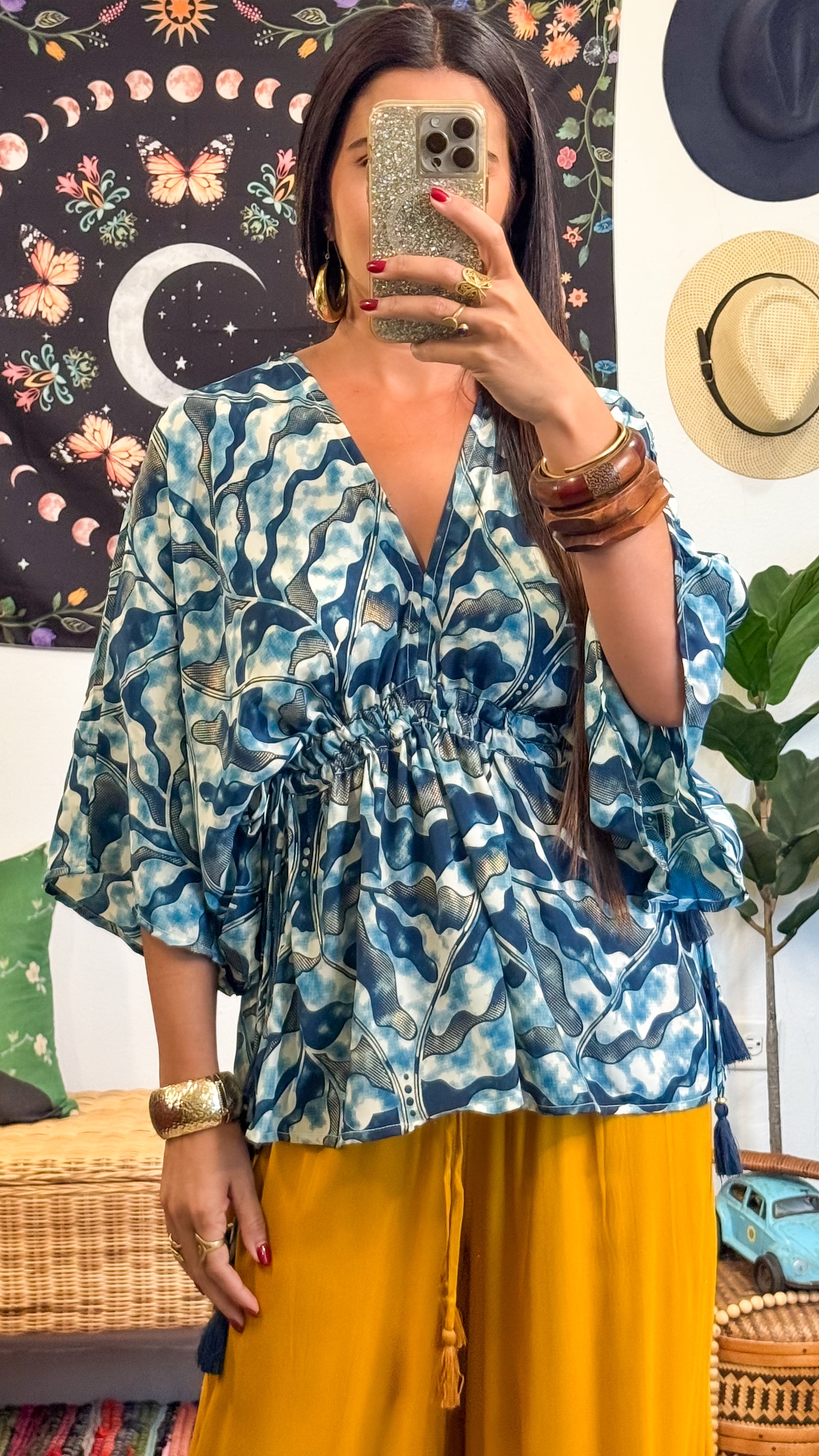 Description》 A flowy, feminine blouse designed for effortless everyday elegance. Featuring adjustable waist ties and a comfortable elastic detail for a flattering, customizable fit. With soft draping sleeves and a relaxed silhouette, this top moves beautifully with you—perfect for styling from day to night About the fit》