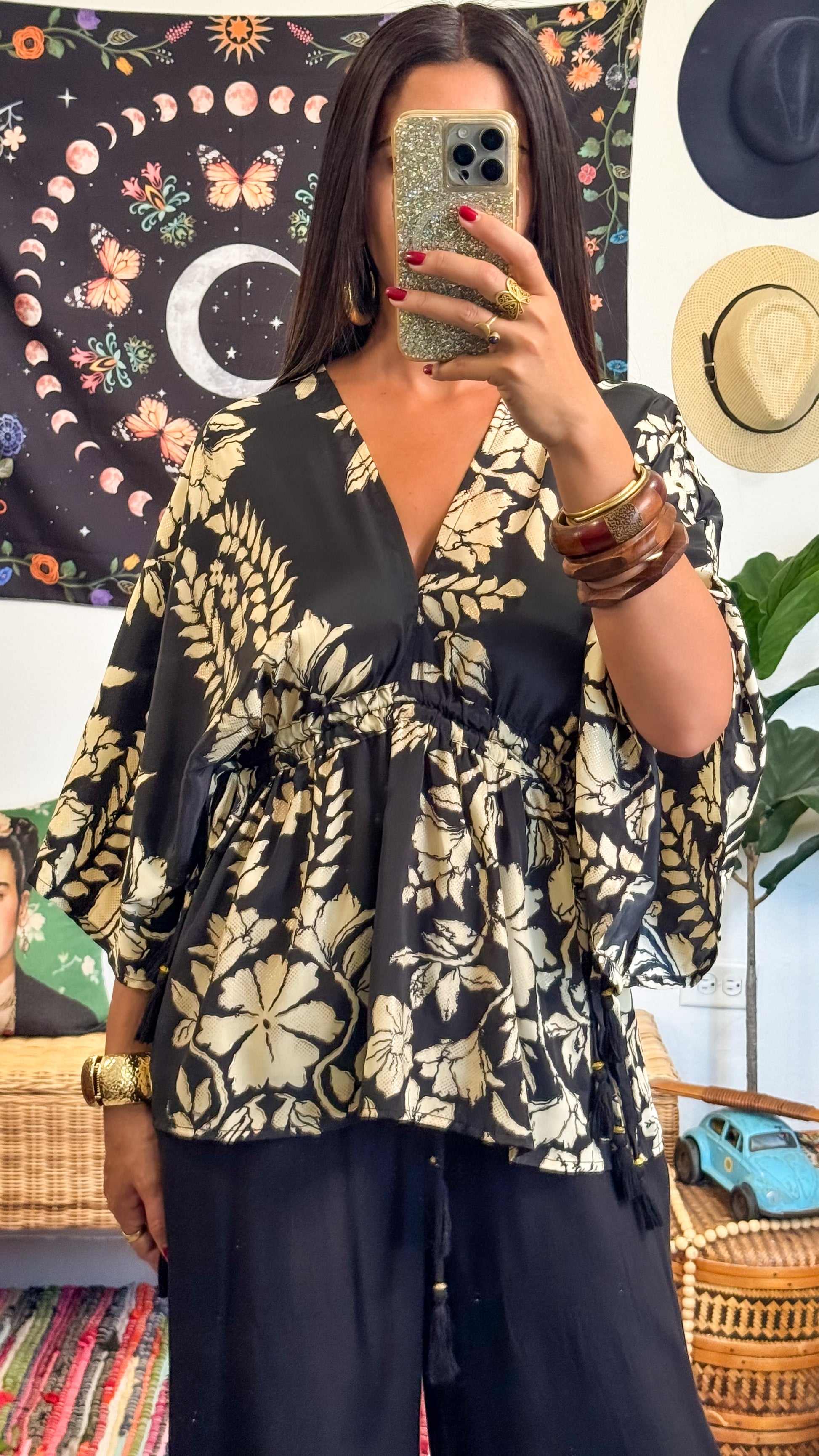 Description》 A flowy, feminine blouse designed for effortless everyday elegance. Featuring adjustable waist ties and a comfortable elastic detail for a flattering, customizable fit. With soft draping sleeves and a relaxed silhouette, this top moves beautifully with you—perfect for styling from day to night About the fit》
