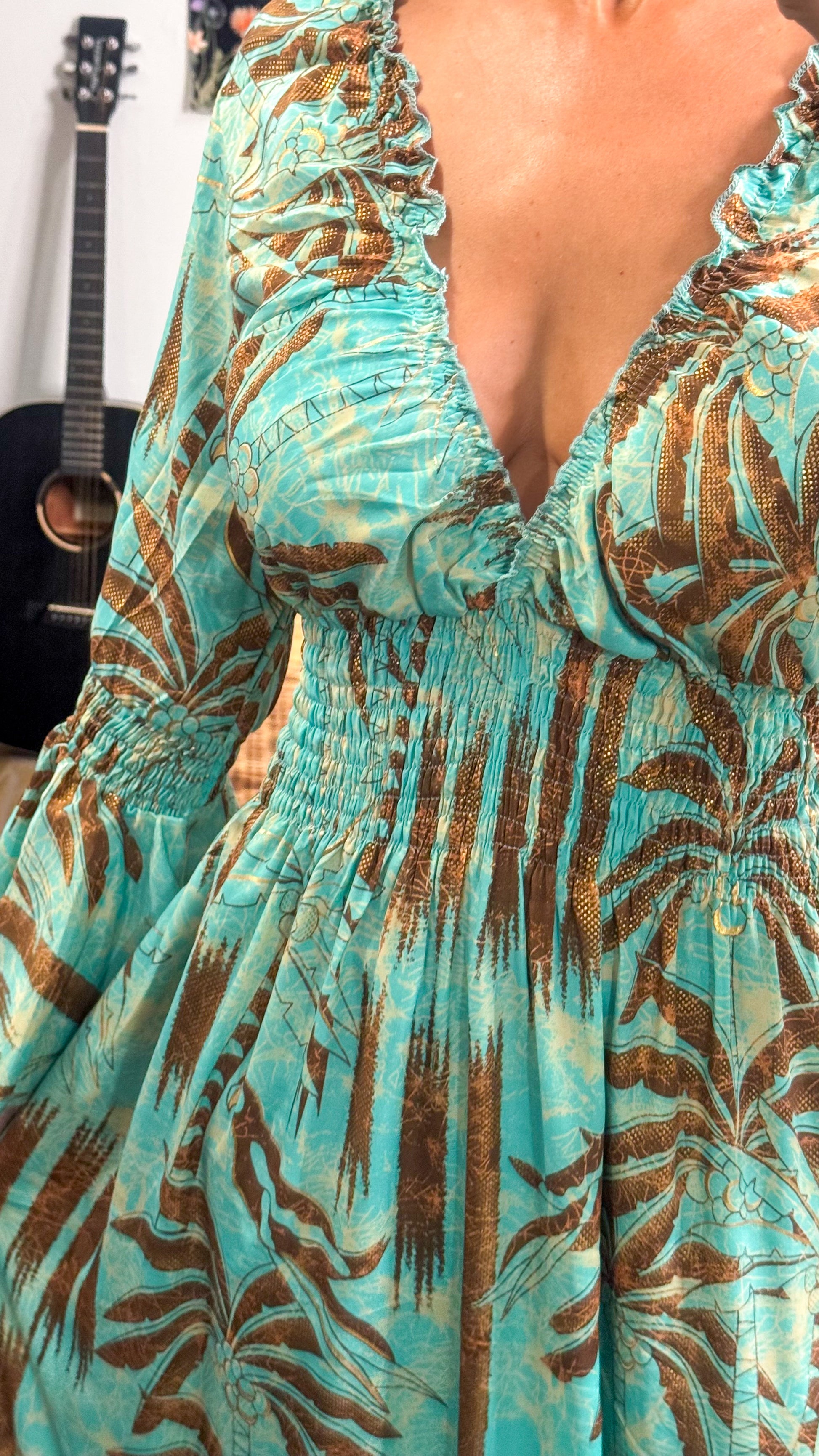 Description》 Step into effortless elegance with this stunning bohemian maxi dress, designed with an gorgeous print that makes a statement. Featuring a deep V-neckline with delicate ruching, flowy bell sleeves, and a flattering smocked waist, it highlights your shape while keeping a relaxed, comfortable fit. The tiered maxi skirt adds graceful movement, making it perfect for both daytime wanderlust and evening gatherings.