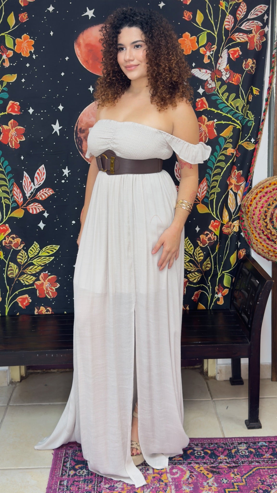 Description》 Off The Shoulder Maxi Dress is always a stunner, no matter the occasion! Elegant elasticized straps, with short sleeves. Smocked bodice. A-line maxi skirt, unlined.
