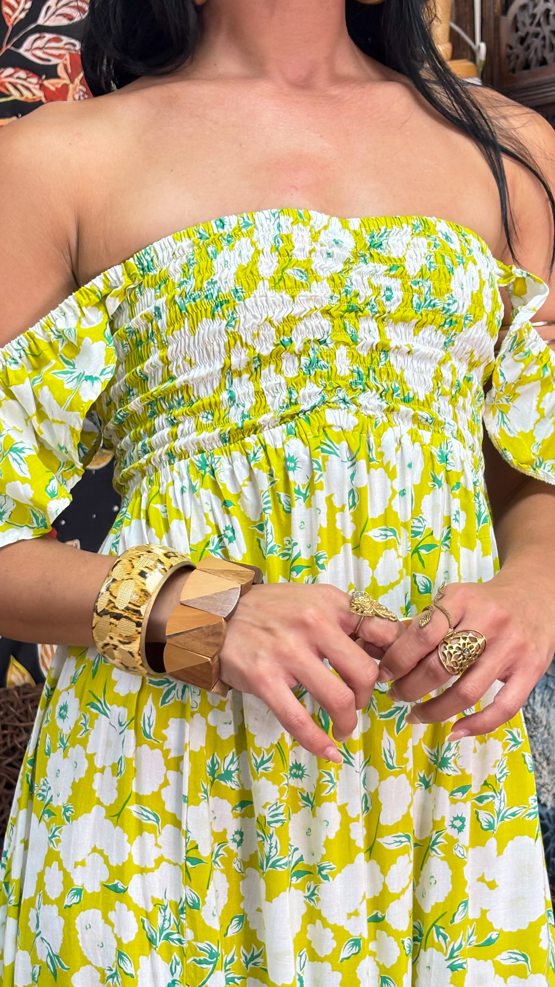 Description》 Elevate your boho style with this flowy off-the-shoulder maxi dress, designed with a smocked bodice that hugs comfortably while enhancing your shape. The relaxed, airy skirt moves beautifully with every step and features a high side slit for a touch of effortless allure. Elastic sleeves allow for both on-shoulder or off-the-shoulder styling, giving you versatility for any occasion. Perfect for vacations, brunch dates, or sunset outings, this dress combines comfort, femininity, and free-spirited charm in one easy statement piece. This garment fits sizes Small through XL