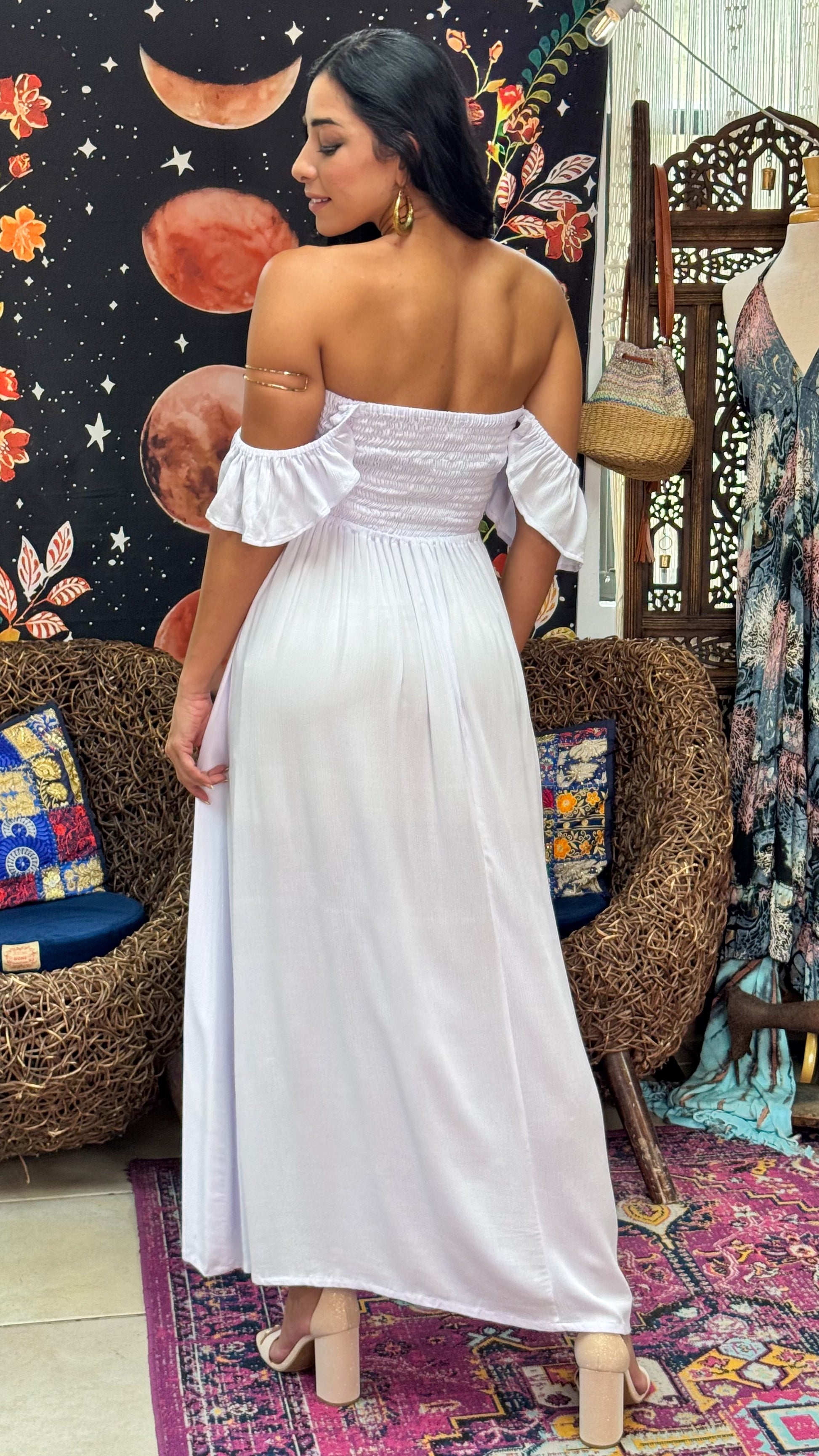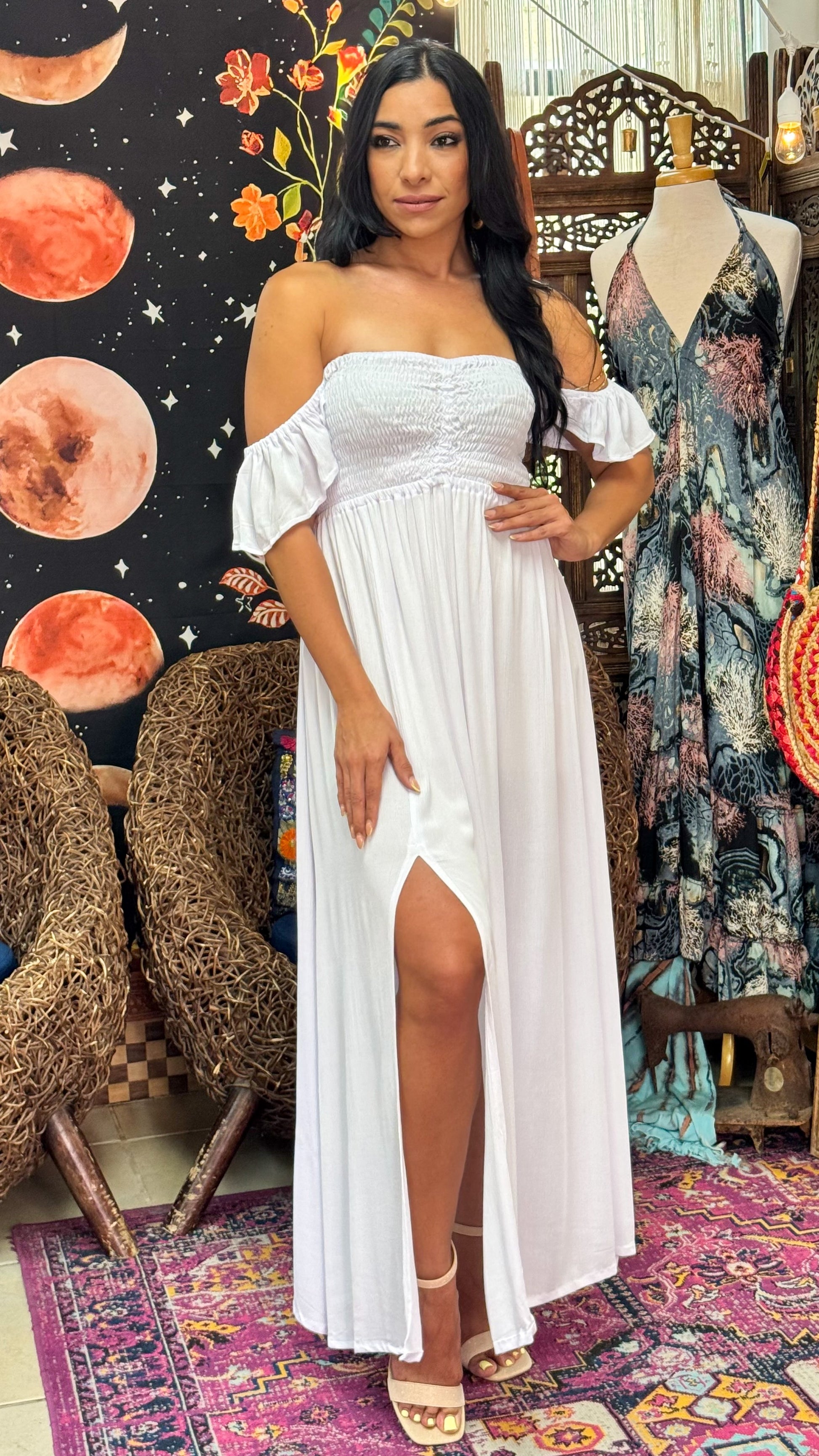 Description》 Elevate your boho style with this flowy off-the-shoulder maxi dress, designed with a smocked bodice that hugs comfortably while enhancing your shape. The relaxed, airy skirt moves beautifully with every step and features a high side slit for a touch of effortless allure. Elastic sleeves allow for both on-shoulder or off-the-shoulder styling, giving you versatility for any occasion. Perfect for vacations, brunch dates, or sunset outings, this dress combines comfort, femininity, and free-spirited charm in one easy statement piece. This garment fits sizes Small through XL