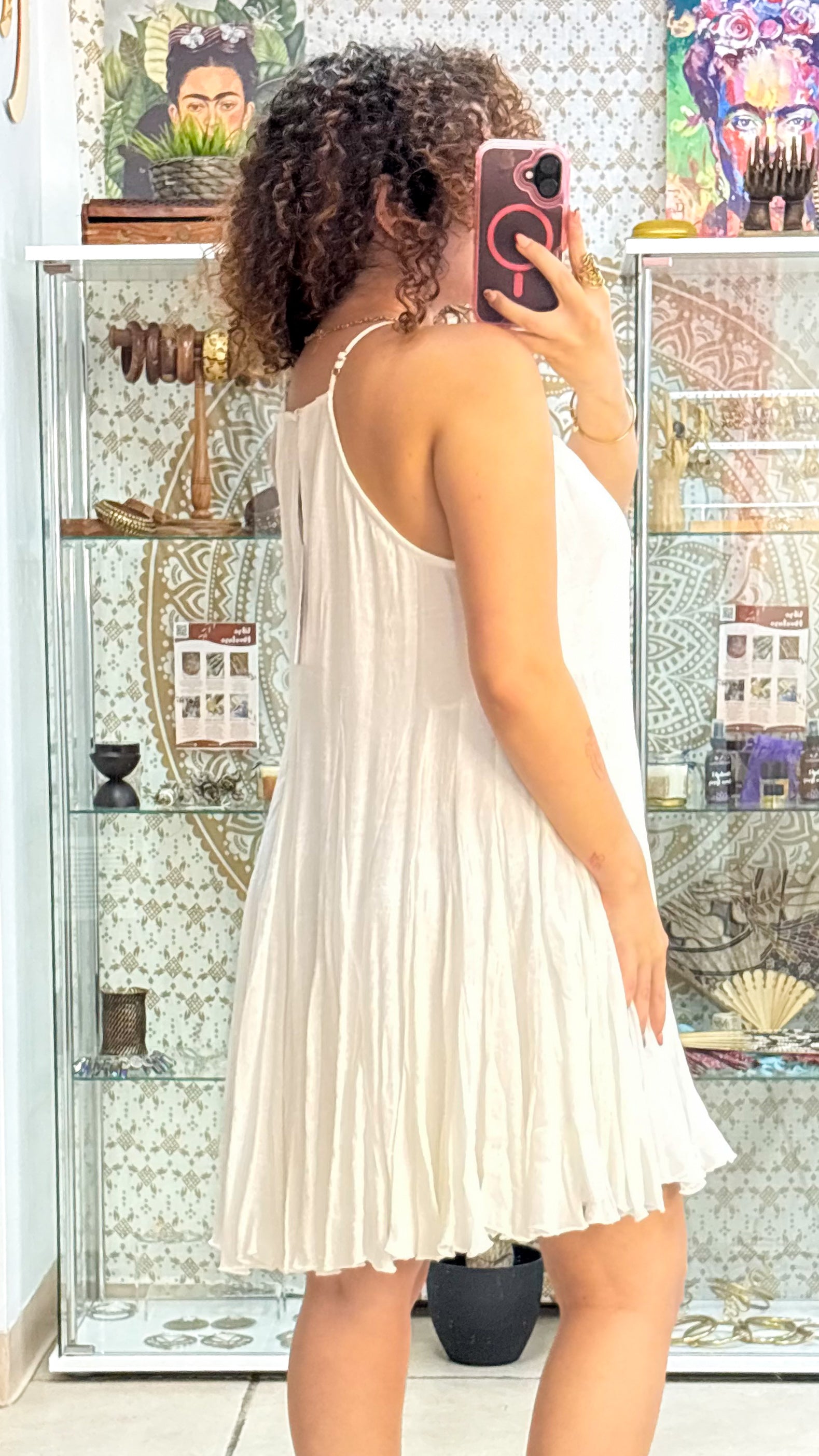Description》 Effortlessly feminine and perfect for any sunny day, this ivory halter dress features a beautifully detailed crochet neckline and a breezy, flowy silhouette that flatters every shape. Made with soft, lightweight fabric, it drapes gracefully with each movement, offering both comfort and style. The crinkled texture adds a relaxed boho touch, while the high neckline and open back keep it playful and chic. Pair it with your favorite sandals or wedges for brunch, beach walks, or summer nights out. ✨ Details: