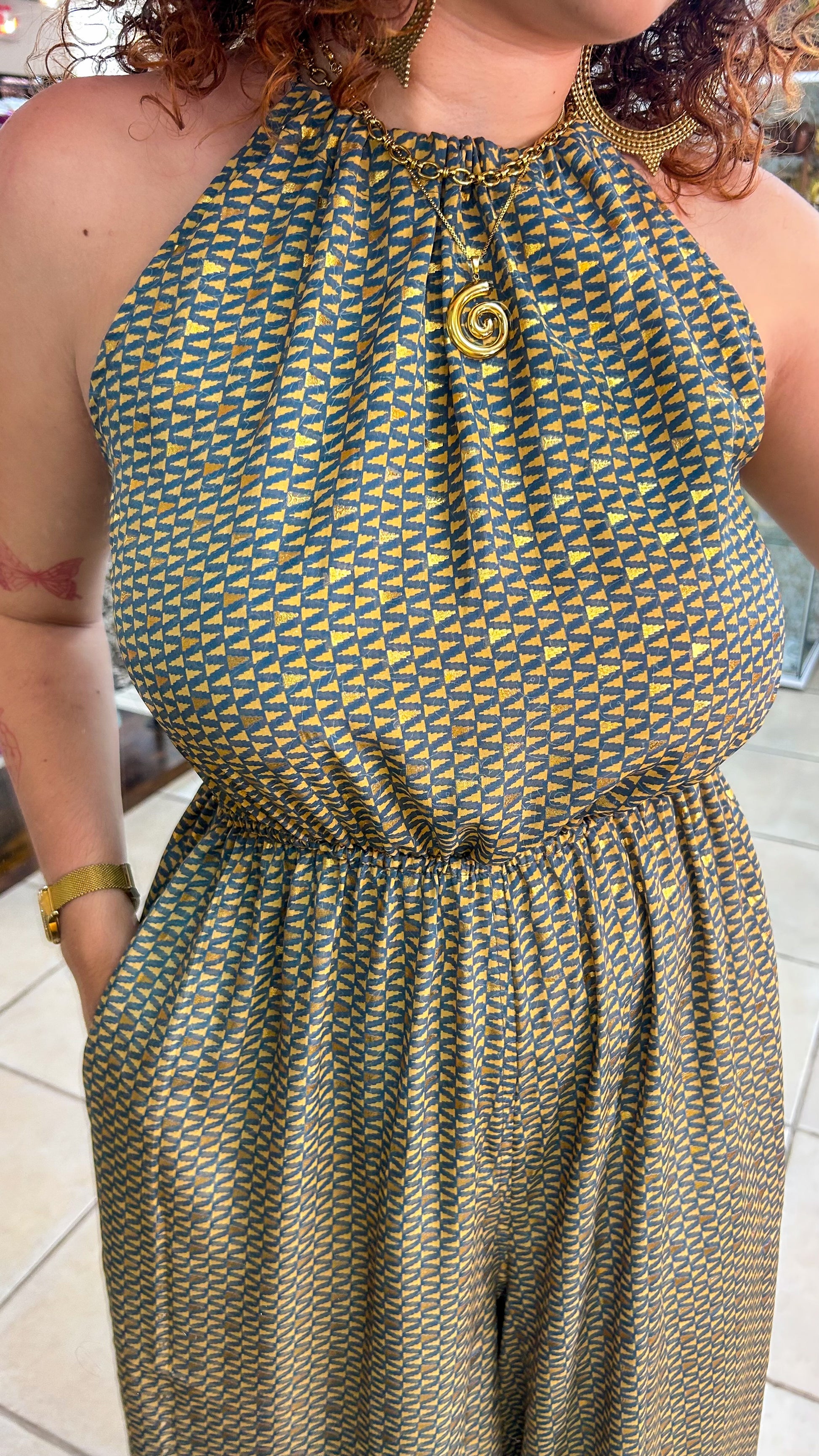 Make a statement in this flowy halter jumpsuit. Designed with a flattering elastic waistband for comfort and shape, and wide-leg pants that create a breezy, elegant silhouette. Perfect for day-to-night wear, this jumpsuit is lightweight, versatile, and effortlessly chic. Side pockets add a touch of practicality without compromising style.