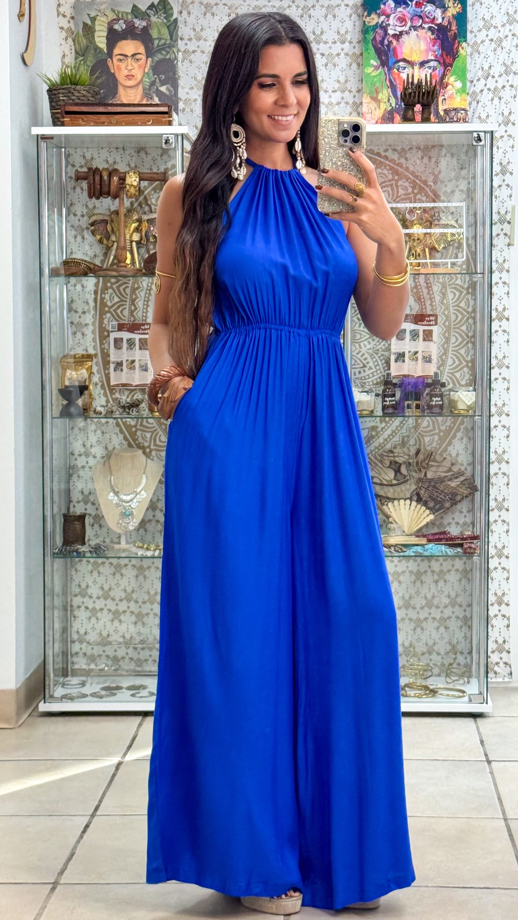 Description》 Make a statement in this flowy halter jumpsuit. Designed with a flattering elastic waistband for comfort and shape, and wide-leg pants that create a breezy, elegant silhouette. Perfect for day-to-night wear, this jumpsuit is lightweight, versatile, and effortlessly chic. Side pockets add a touch of practicality without compromising style.