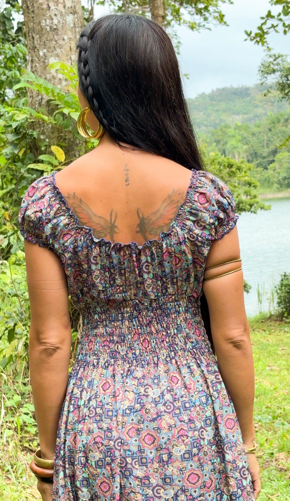 Description》 Turn heads with this effortlessly chic maxi dress featuring a unique boho-inspired print in warm earthy tones. Designed with a flattering smocked waist, feminine ruffle details, and a versatile neckline that can be worn on or off the shoulders, this dress is as comfortable as it is stylish. The flowy tiered skirt moves gracefully with every step, making it the perfect choice for sunny days, weekend getaways, or evening gatherings. Lightweight and breathable, it’s your go-to piece for embracing that free-spirited bohemian lifestyle. About the fit》