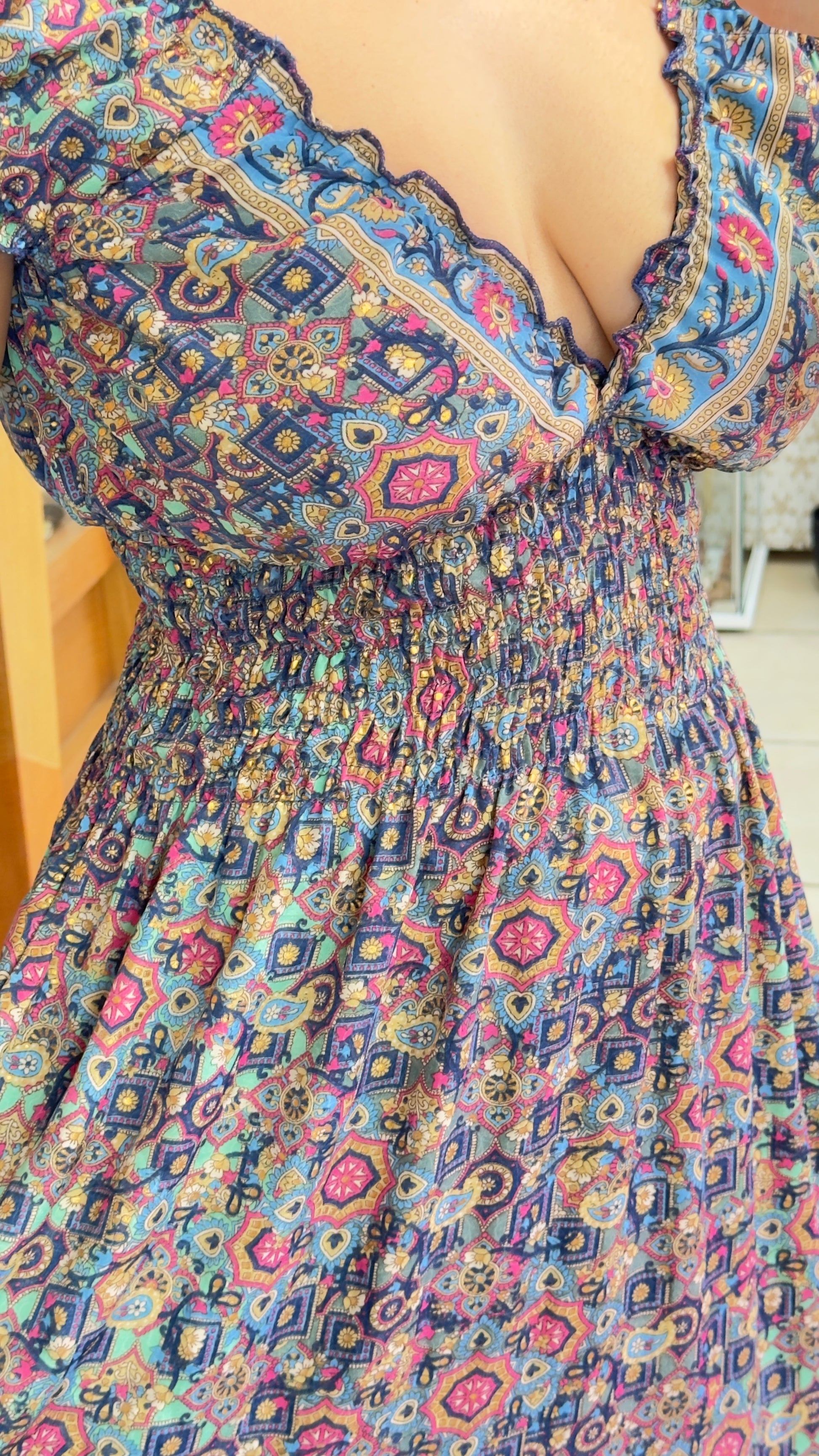 Description》 Turn heads with this effortlessly chic maxi dress featuring a unique boho-inspired print in warm earthy tones. Designed with a flattering smocked waist, feminine ruffle details, and a versatile neckline that can be worn on or off the shoulders, this dress is as comfortable as it is stylish. The flowy tiered skirt moves gracefully with every step, making it the perfect choice for sunny days, weekend getaways, or evening gatherings. Lightweight and breathable, it’s your go-to piece for embracing that free-spirited bohemian lifestyle. About the fit》