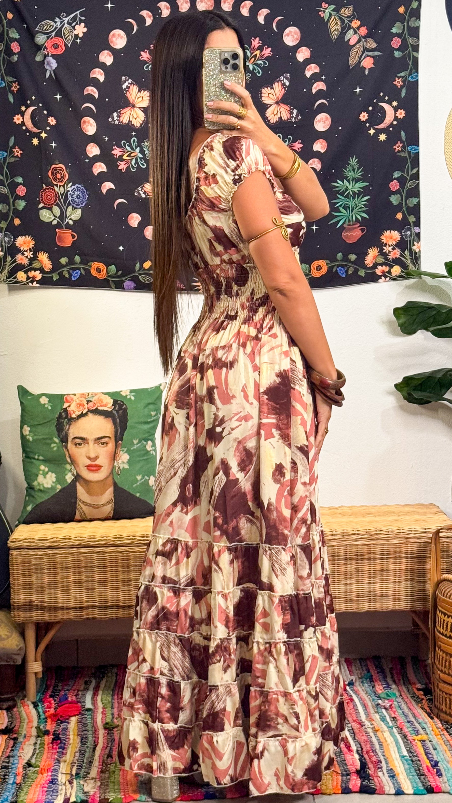 Turn heads with this effortlessly chic maxi dress featuring a unique boho-inspired print in warm earthy tones. Designed with a flattering smocked waist, feminine ruffle details, and a versatile neckline that can be worn on or off the shoulders, this dress is as comfortable as it is stylish. The flowy tiered skirt moves gracefully with every step, making it the perfect choice for sunny days, weekend getaways, or evening gatherings. Lightweight and breathable, it’s your go-to piece for embracing that free-spirited bohemian lifestyle.
