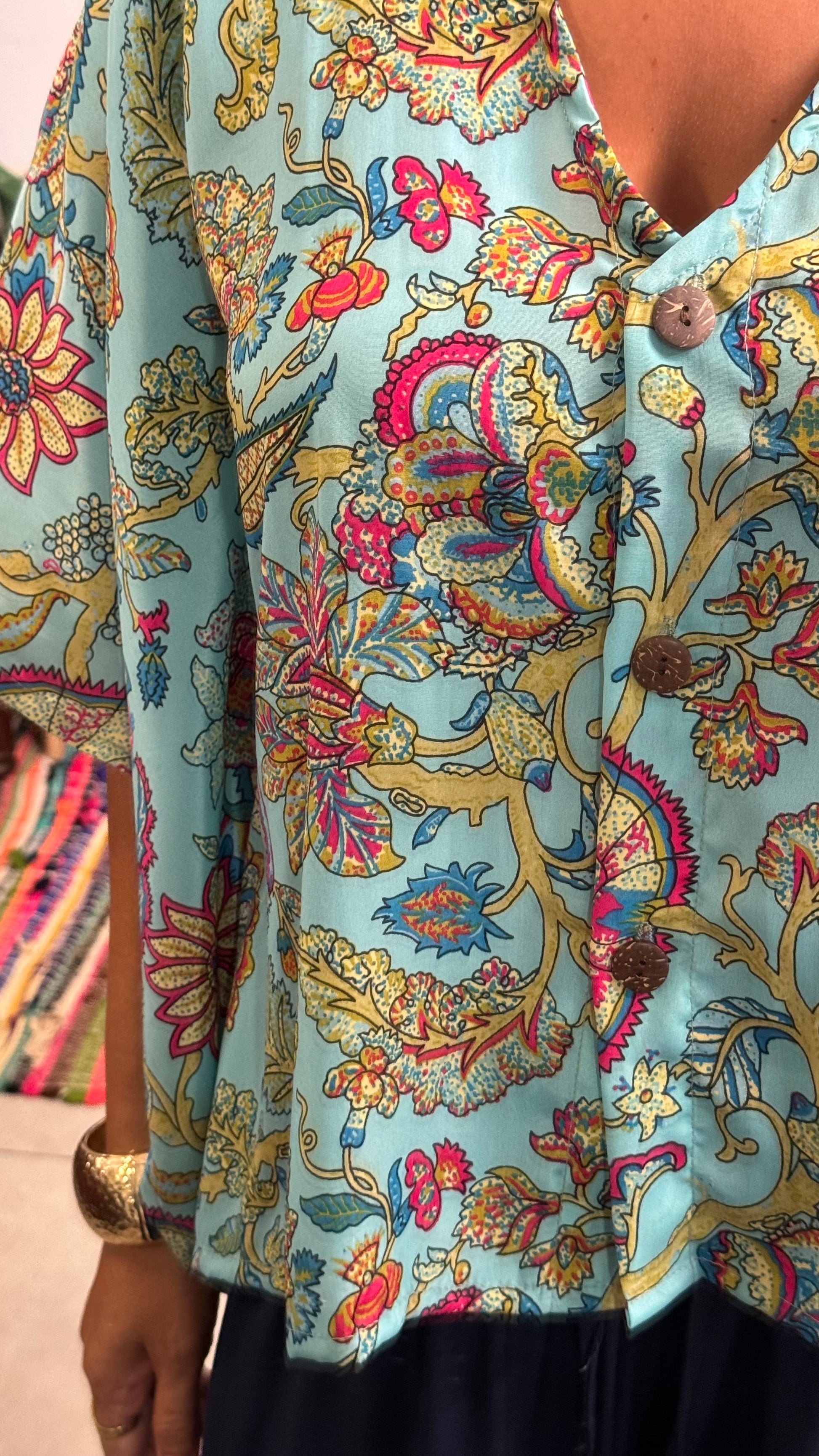 This top features a relaxed, flowy silhouette with a flattering V-neckline and front button closure. The wide kimono sleeves add effortless movement and bohemian charm, while the adjustable drawstring waist allows you to shape it to your preference. Lightweight and breathable, it’s perfect for layering or wearing on its own for an easy, elegant look. About the fit》