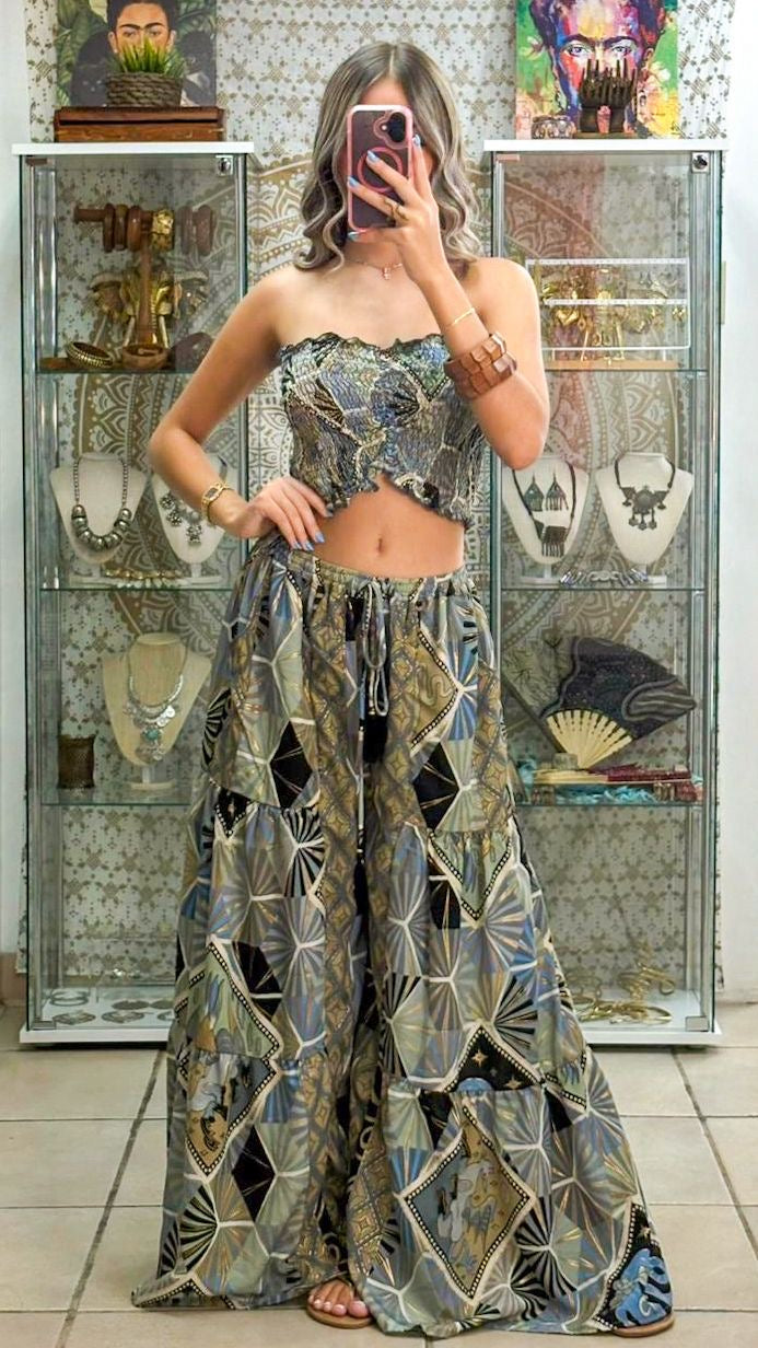 Flowy and effortlessly chic, these wide-leg pants are designed with a bohemian spirit in mind. Featuring a comfortable smocked waistband with adjustable drawstring and tassel detail, they offer both style and ease. The lightweight fabric allows for graceful movement, making them perfect for any occasion—from relaxed beach days to elegant boho evenings.