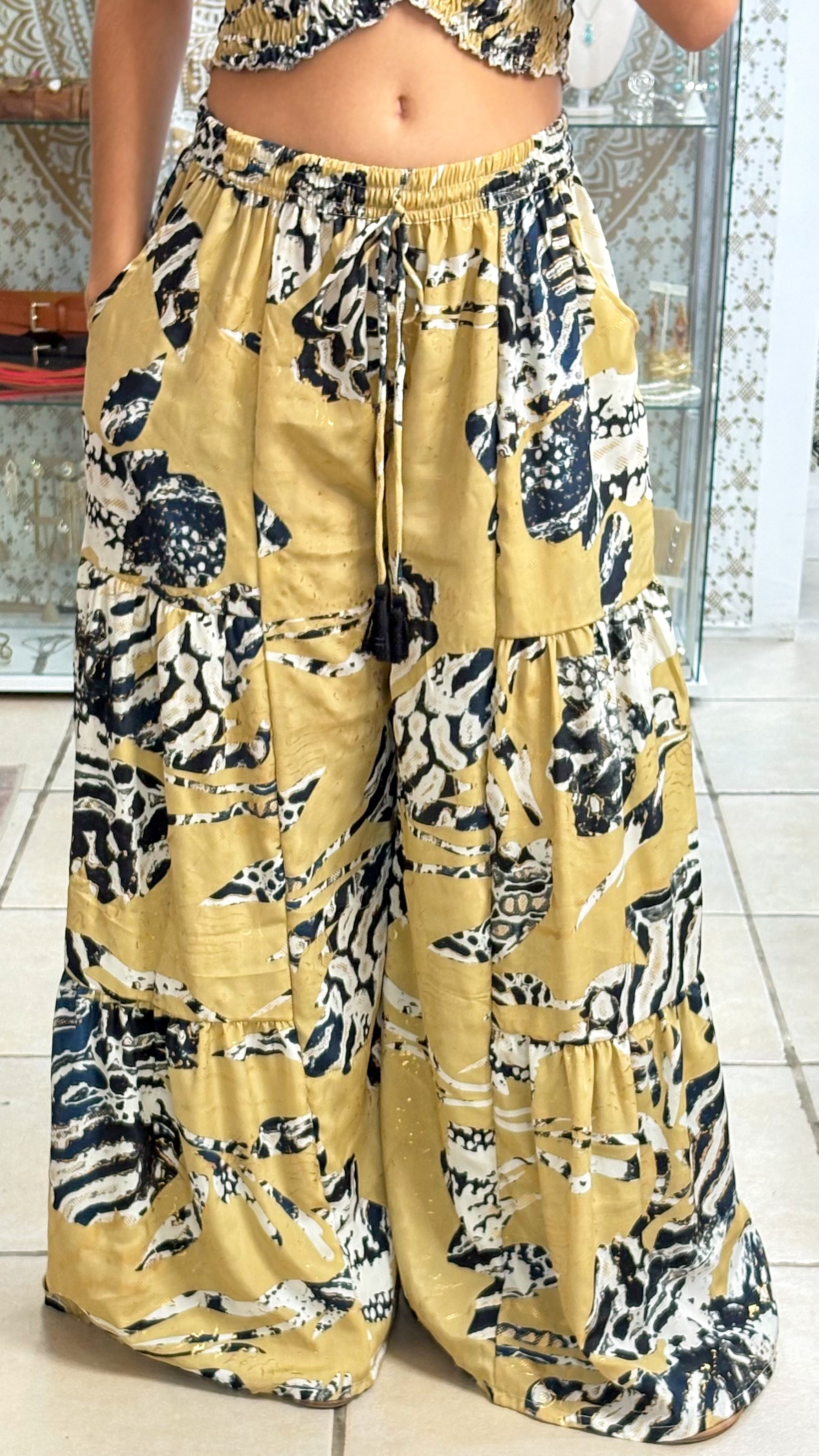 These wide-leg boho pants bring effortless comfort and style to your everyday look. Designed with a relaxed, flowy silhouette, they feature an elastic waistband with adjustable drawstrings and tassel accents for the perfect fit. The lightweight fabric moves beautifully with every step, making them ideal for warm weather, travel days, or laid-back outings. Side pockets add practicality without compromising the airy, free-spirited vibe. A must-have staple for anyone who loves comfort with a touch of boho elegance.