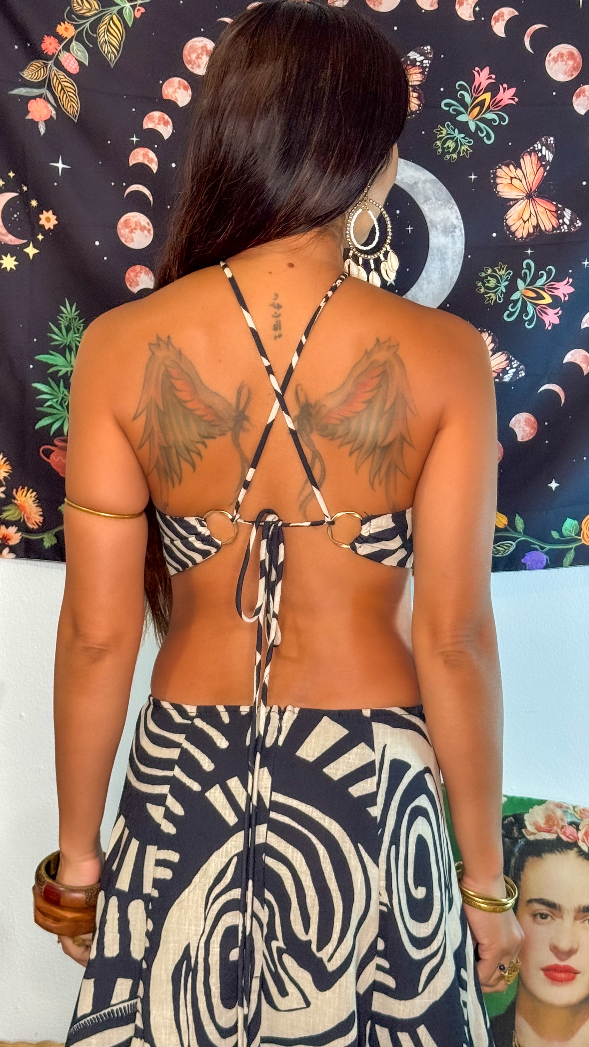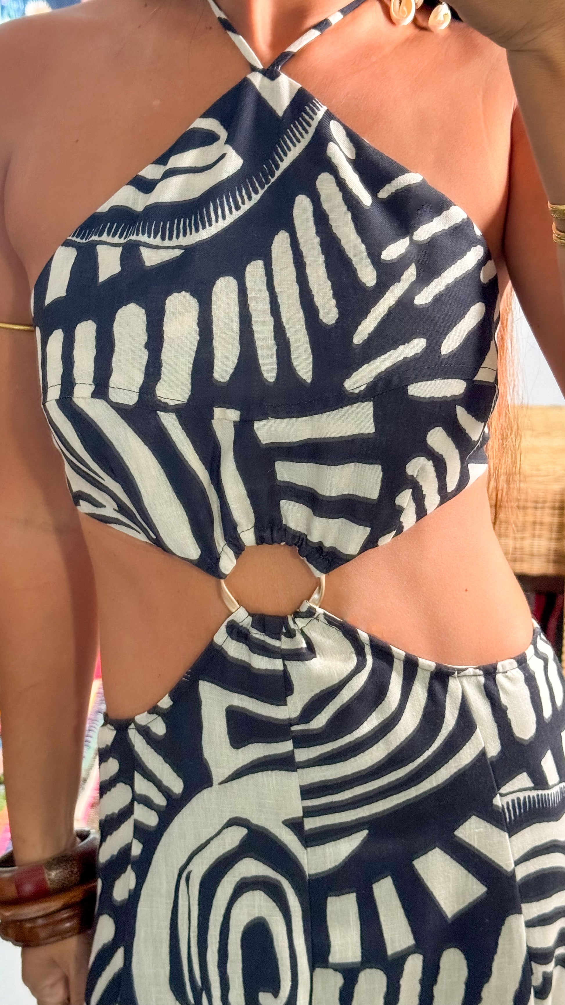 Description》 This striking boho maxi dress features an abstract tribal-inspired print and a flowy A-line silhouette. With a halter neckline, center ring detail, and playful side cutouts, it exudes effortless summer allure. The open back with adjustable tie straps adds a sultry touch, perfect for beach getaways or sunset soirées.