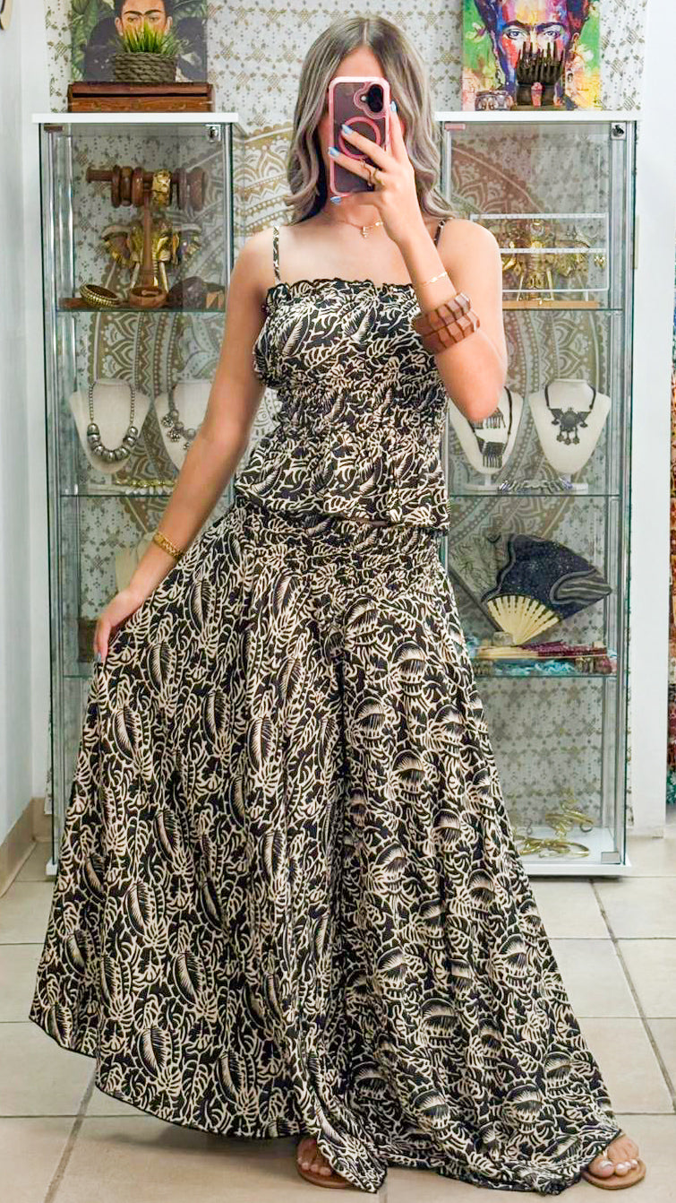 Step into effortless bohemian elegance with these flowy wide-leg pants, designed for comfort and style. Featuring a smocked elastic waistband that flatters the waist while providing a flexible fit, these pants move beautifully with every step. The lightweight fabric showcases a unique teal and cream geometric leaf print with subtle zebra-inspired details, giving them a chic yet relaxed vibe. Perfect for styling with a simple crop top or kimono, they can be dressed up for a night out or worn casually for a laid-back day. A versatile must-have piece for your boho wardrobe.