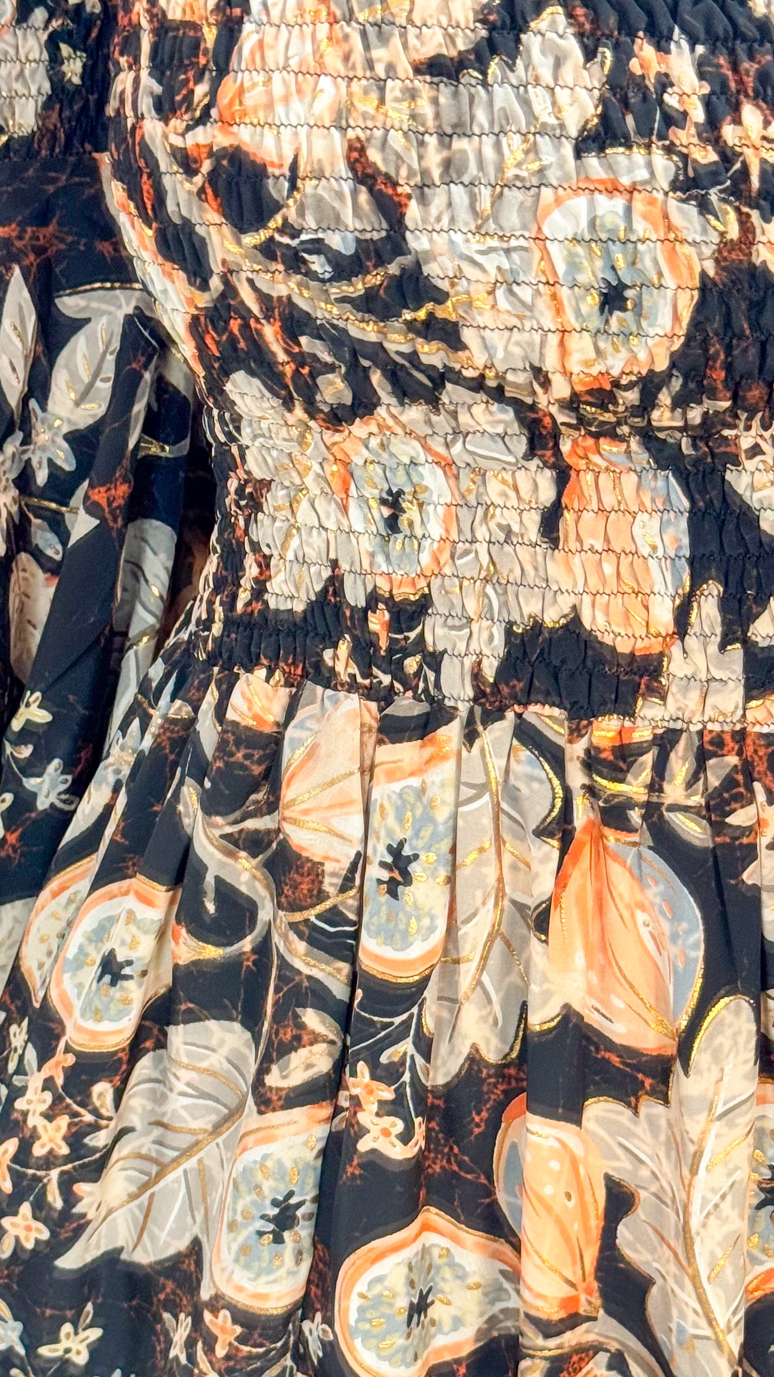 Description》 Look super chic on your next exotic getaway when you wear the Tropical Vibes Smocked Maxi Dress! This breezy silky dress, features bell long sleeves and drapes from a off the shoulder smocked bodice with an alluring side slit.